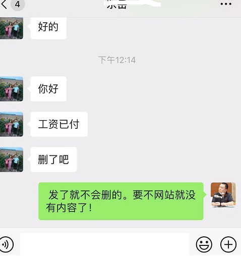 前天(2月2日)法讯网发布的《甘肃古浪:患病村民何时才能拿到拖欠的血汗钱》后,引起强烈反响。当事人已经在昨天(2月3日)领到了拖欠的工资。 2月3日12时许,当事人王泰山发来信息:工资已付。删了吧。法讯君答复:发了就不会删的,要不网站就没有内容了。 当事人发来的领条和微信收款截图。并表示:他们全在这。 法讯君为患病村民王泰山感到高兴,当即为此发了朋友圈,特说:不好意思,文章是不能删除的。七台河人民医院当时发了解决问题后当事人也是要求删除。这不可能! 王泰山再次发来信息:刚把钱发了。谢谢。删了吧。法讯君答复:不能删的,可以写个后续说工资已发,见朋友圈。他便发视频通话给我,吃饭的法讯君不予理睬。 之后自称古浪县人社局的徐述才添加了法讯君的微信。 饭后法讯君出去办事,接到了显示甘肃武威市的电话,对方言语不清。最后听明白说是王泰山,还是要求删帖。我答复说不可能。然后一普通话的口音传来,自称是古浪县人社局的工作人员。他要求删帖。法讯君答复不可能。对方说对王泰山也不好。法讯君说发了朋友圈说了工资已经领到。对方说不够,法讯君答复明天发个后续说工资已经领取。对方说今天写了发。法讯君答复不能。而后对方几次说今天写了发。法讯君生气了:你说今天就今天啊?我为什么听你的?我在外办事呢!听此,对方才说那明天早点吧。 办事回家,才发现微信里那个古浪县人社局的徐述才发来语音电话。 而据了解,现场去的有古浪县公安的、劳动监察大队的、社保局的、土门镇的,龙腾公司的人。 古浪公安去做什么呢?他们拿的个执法仪,问王泰山怎么联系的法讯君。并说:后果想没想,舆论性多强。还问收费了没有?给了多少钱?答复说没有收费,确确实实没有收费。他们说不可能免费为你做的,是不是事成之后付费?答复是说没有,让他们看了聊天记录,说是没收过费用。之后的重点就是让删帖。 这么多部门去村委,那处罚了隆腾公司没有?王泰山说没有。法讯君微信询问古浪人社局的徐述才,没有回应。 下午六时许,患病村民王泰山朋友圈发布消息,感谢古浪县诸多人士帮他要回了血汗钱。 对此,法讯君要说的是:古浪县对舆论的重视值得肯定,及时处理解决问题也值得赞扬。唯一不足的是不应该大动干戈地要求删帖,这不画蛇添足吗?假如法讯君和你们的思维同步,收取了弱势群体的王泰山的钱而写稿发布,岂不是牢狱加身了? 看来,为弱势群体发声,真他妈的难啊!(李堂平) |