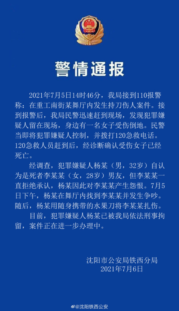 潇湘晨报综合沈阳铁西公安消息 2021年7月5日14时46分,沈阳市公安局铁西分局接到报警称:在重工南街某舞厅内发生持刀伤人案件。接到报警后,民警迅速赶到现场,发现犯罪嫌疑人留在现场,身边有一名女子受伤倒地。民警当即将犯罪嫌疑人控制,并拨打120急救电话。120急救人员赶到后,经诊断确认受伤女子已身亡。 经调查,犯罪嫌疑人杨某(男,32岁)自认为是死者李某某(女,28岁)男友,但李某某一直拒绝承认,杨某因此对李某某产生怨恨。7月5日下午,杨某在舞厅找到李某某并发生争吵。随后,杨某用随身携带的水果刀将李某某扎伤。 目前,犯罪嫌疑人杨某已被依法刑事拘留,案件正在进一步办理中。 |