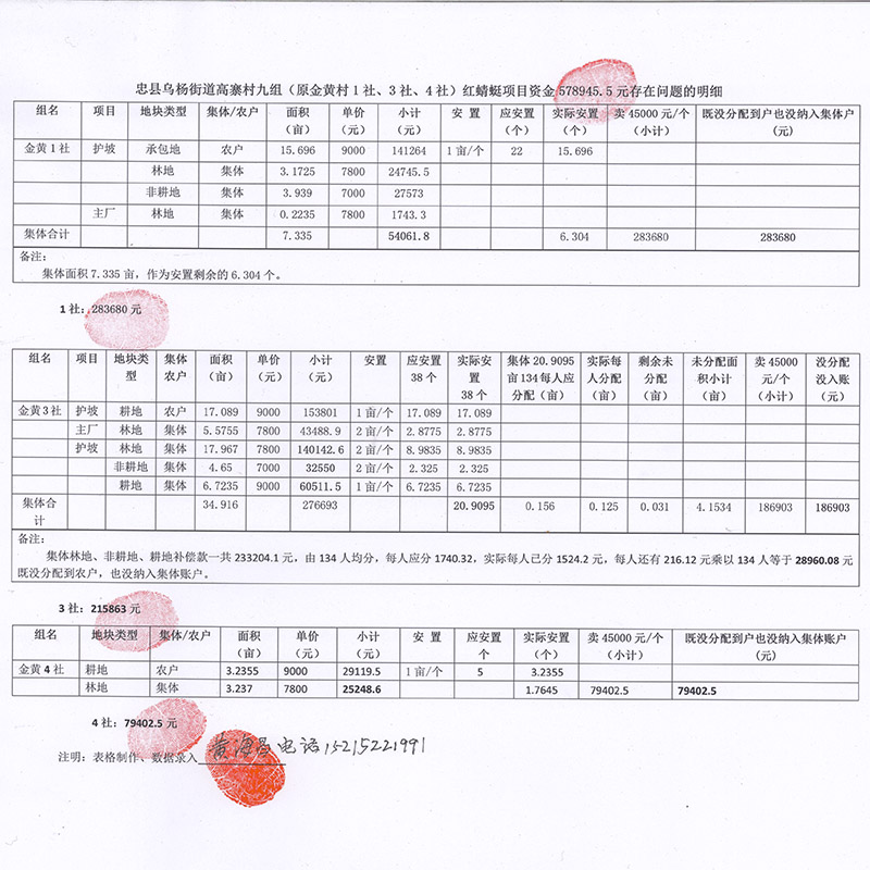 | 强烈请求调查忠县乌杨街道办高寨村57.8945万元项目资金去向 2021年3月26日,我们在发布了一篇题为《重庆市忠县乌杨街道办事处高寨村级财务监督为何这么难!》的贴文,引发社会关注,网上点击率高达2万余次。其中,自称“赵总”的网友在问证据在哪里?还有一位叫“天X建”的网友QQ与网站联系,说这里边反映的问题是通过中央纪委责重庆市忠县纪委处理过,结论是该反映不符合事实。里面所列举的法律问题也是歪曲理解法律条款。在此决定,补充证据,回答两位网友。 网友“赵总”不是在问证据在哪里? 首先,57.8945万元红蜻蜓油料项目资金,既没有分配到户也没有纳入集体账户。 ![]() 图:村务公开整理出来的数据 高寨村九组原金黄村1社22个社保名额,护坡农户承包面积15.696亩,1亩/个社保,共15.696个 。差6.304个,由集体林地、非耕地7.335亩作为安置,以4.5万元/个一共卖了28.3680万元。 高寨村九组原金黄村3社38个社保名额,护坡农户耕地面积17.089亩,1亩/个社保,共17.089个。差20.9095个,也就是集体主厂林地、护坡林地、非耕地、耕地20.9095亩面积,并将该面积分摊到134名集体成员,每人应分0.156亩,实分0.125亩,还剩0.031亩没分,合计4.1534亩,又以4.5万元/亩卖给农户,共卖了18.6903万元;集体林地、非耕地、耕地补偿款一共23.32041万元,分给134名集体成员,每人应分1740.32元,已分1524.2元,还剩216.12元共28960.08元。 高寨村九组原金黄村4社5个社保名额,农户耕地面积3.2355亩,1亩/个社保,共3.2355个。差1.7645个,由集体林地面积3.237亩作为安置,1.7645个名额以4.5万元/个一共卖了7.94025万元。 三个社资金一共57.8945万元,既没有分配到农户,也没有纳入集体账户。 其次,多人未被征地却享受安置,村主任妻子将4.5万社保款占为己有。 ![]() 图:村务公开及社长提供的分摊社保钱的清单 2017年,修建忠县生态工业园自来水厂,征用高寨村八组原三岭村7社面积8.31亩,安置6个社保名额。 时任高寨村主任冉龙玉将7社6个名额拿出3个以4.5万元/个卖给村主任所在6社未被征用土地农户罗洪平、闫桂群、闫海芳,其中闫海芳是村主任的妻子。 罗洪平、闫桂群一共9万元拿出来分配到6社各农户。闫海芳4.5万元没有拿出来分配。三岭村6社分社保名单显示,也证实仅分了8.86965万元。 三岭7社3个名额也是以4.5万元/个卖给7社农户冉龙海、李仁秀、闫术英,一共13.5万元,全部分配到各农户。 7社被征用本人和集体小块分配部分有面积的冉龙华、冉龙海、冉从富、冉从桂都与没有被征用面积的闫术英以4.5万元/个社保进行购买。 另外,17.967亩集体柴林,仅卖4500元依据是什么? 高寨村九组原金黄村3社红蜻蜓油料项目主厂区占用集体柴林面积5.5755亩,经社员大会讨论通过,一共卖了7000元,其中1000元归中标者冉孟发,另外6000元归社集体。那么,护坡柴林面积17.957亩,是主厂区集体柴林面积5.5755亩的3.227倍,仅卖了(集体所有)4500元,请问只卖4500元的依据是什么?经社员大会讨论过吗? 网友“天X建”说我们反映的问题是通过中央纪委责重庆市忠县纪委处理过,结论是该反映不符合事实。里面所列举的法律问题也是歪曲理解法律条款。 请问忠县纪委哪一位工作人员亲自来找我们黄海昌、冉龙华、冉龙海三个人核实过相关证据的?反映的问题哪些不符合事实?调查情况及处理的结果是什么?处理的结果是书信回复还是电话回复的?我们为什么得不到回音?我们举报的问题如果属实应该依法追究相关责任人的责任,如果不属实纪委应该通过媒体辟谣同时依法追究我们几个举报人的相关责任?为什么不追究?又请问我们列举的法律问题哪一条又是歪曲理解的?涉及到57.8945万元红蜻蜓油料项目资金既没有分配到户也没有纳入集体账户合理合法吗?网上曝光后至今四个多月时间了,难道忠县纪委的领导同志就没有看见?或者不属于您们核查范围? 这一篇贴文发表后,请求忠县纪委及相关职能部门实地仔细核查乌杨街道办事处高寨村涉57.8945万元项目资金的去向。(请求人:黄海昌 冉龙海 冉龙华) |