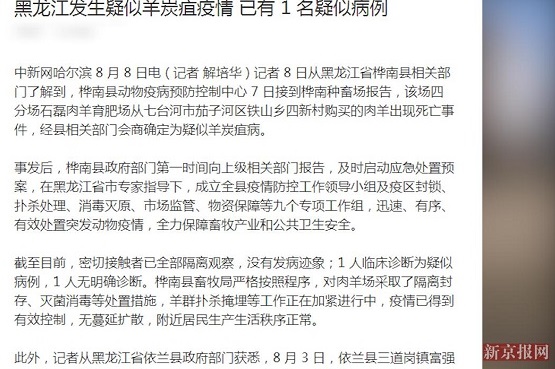 据中国新闻网8日报道,黑龙江桦南县桦南种畜场一肉羊育肥场购买的肉羊出现死亡事件,疑羊炭疽病。目前羊群扑杀掩埋等工作正在加紧进行,疫情已有效控制,无蔓延扩散。什么是炭疽病?专家称这是一种由炭疽杆菌引起的人畜共患急性传染病,人类因直接或间接接触病畜才会发生感染,早发现早治疗,治愈率很高。