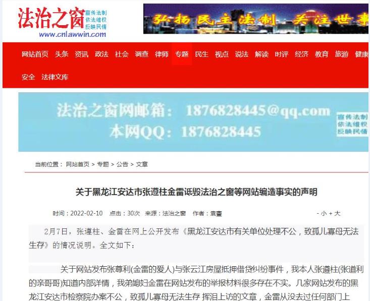 ![]() 关于黑龙江安达市张遵柱金雷诋毁法治之窗等网站编造事实的声明 2月7日,张遵柱、金雷在网上公开发布《黑龙江安达市有关单位处理不公,致孤儿寡母无法生存》的情况说明。全文如下: 关于网站发布张尊利(金雷的爱人)与张云江房屋抵押借贷纠纷事件,我本人张遵柱(张道利的亲哥哥)知道内部详情,我弟媳妇金雷在网站发布的举报材料很多存在不实。几家网站发布的黑龙江安达市检察院办案不公,致孤儿寡母无法生存 挥泪上访的文章,金雷从没去过任何部门上访,一直在家与孩子生活,网站发表文章说金雷上访,这是编造事实,任何部门没有上访记录,文章内容多处与事实不符,网站发表不实文章后,金雷找到了法治之窗网站的工作人员,金雷的强烈要求下把不实的文章下架,后不知道什么原因又有几家网站发表此文章,金雷并没有委托其网站发表不实的文章,也没有其网站工作人员找金雷了解事实真相,网站不经核实就发表不实信息。因其网站发表的文章给金雷和家人造成很大的生活影响,决定对发布不实信息的网站追责。特此说明,要求网报,一瞅,法讯,民呼等网站撤稿,以免造成更大影响。2021年金雷到安达市报案,说自家的房子被人骗走了,安达市依法进行调查,找到了当事人和相关知情人等依法进行调查核实,证据确凿,认为被告人不够成犯罪,双方是属于经济纠纷,安达市出据了不予立案通知书,金雷随后向安达市检察院申请立案监督,安达市检察院接到申请后,依法对此案进行调查核实,核实后认为出据的不予立案理由充分。接到检察院的不予立案监督审查通知后,起初金雷还是想不明白,因为当年的事情是由她爱人张尊利所办,中间有很多过程细节金雷不知细情。经安达市调查后才还原了当年事实的真像。房子不是2017年2月6日当天卖的,是借款后一年左右出卖的,因为张遵柱知细情,常年不在家,回家过年才知道此事,特此澄清事实。当时出借人为了和借款日期相符,把更名后的房子票据写成2017年2月6日,金雷找到律师咨询此事,律师询问了此事的前后过程,并拿出相关材料,律师向金雷解释了相关的法律要件,让金雷到法院起诉,并要求网站撤稿,挽回金雷及相关部门名誉及其他损失。金雷这才明白应该怎么去拿起法律的武器来维护自己的利益,现在金雷决定找当事人商量和解此事,如果和解不成向法院提起诉讼。挽回自家的经济损失。 情况说明人:张遵柱 金雷 2022年2月5日