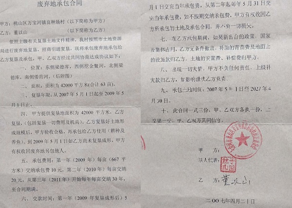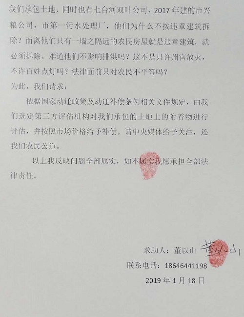 求助信 中央媒体:我叫董以山,男52岁,是黑龙江省七台河市桃山区万宝河镇村民,身份证:23090319670721****.现控告七台河市桃山区政府在拆迁我家承包的土地及地面附着物过程中欺农,害农,坑农的违法事实。 一、基本情况 2018年3月,七台河动迁办让村里通知我到我家承包土地动迁,量了一天后就撤离了,隔几天,村里又通知我研究动迁,这次主持动迁单位不是市动迁办,是桃山区棚改办,棚改办对我承包土地及附着物登记造册后,让我在清单上签字,同年5月12日,桃山区防汛指挥部突然对我下达限期清除障碍通知书,让我自行清除我承包三十多年土地上鸡舍、猪舍、看护房、山庄、养鱼池、蔬菜大棚等地面的附着物,我当时与防汛指挥部的人发生争执,也未同意自行清除,并拒绝签字。5月18日,区棚改办带着推土机,铲车强行将我鸡舍、猪舍、看护房等拆除面积779.5平方米。同时被强行拆除的还有几十家村民的地面附着物。6月,我们被强拆村民开始上访,区政府强拆违法行为停止。10月3日,棚改办召集我们研究下一步拆迁评估。让我们选择第三方评估机构,在三家评估公司我们当时选择了哈尔滨市一家评估公司。可是,由于哈尔滨评估公司依据市场价格对我们尚未动迁的地面附着物进行评估,与政府欲给我们所谓成本价相差太多。只用他们评估一天就撵走了。然后用本市一家评估公司进行评估,评估出的价格比市场价低出两倍。有的连成本价都没达到。如养鱼池每米作价35~50元。成本价最少150元,连推一平方米机动车油的费用都不够。更为严重的是棚改办对我们的看护房,鸡舍、猪舍、平房、农家乐、山庄、树木等不给评估,认定这些建筑是违章建筑,不给补偿。同时,对于定价拆迁的标的物让我们转让给七台河市城投公司,不让我们和市政府直接签订补偿协议,其手段十分卑劣,真是坑农害农,损害农民利益的违法杰作。希望在全国各大媒体给予曝光。 村委收到董以山的房号款出具的收据 废弃地承包合同 农业部制发的水域滩涂养殖使用证 二、请求与理由 我家从1982年开始承包,至今已超过三十一年。在承包期间,村里、镇里鼓励我们在承包的土地上栽树、盖鸡、猪舍、修鱼塘发展农牧渔副业。我们盖的房屋,包括鸡舍、猪舍、温室大棚、看护房大都是《防洪法》公布前(1998年1月1日公布)盖的,那时尚未有防洪法,区政府却以我们违法《防洪法》为依据,认定我们的房屋是违章建筑,真是欲加之罪何患无辞。我们承包的土地有承包合同、土地使用证,与河道管理不发生任何关系,三十年没有影响排洪、泄洪。我们在自己承包的土地上建房、搞副业也合理合法,应受到中央一号文件的保护。区政府认定行洪区范围内不仅有我们承包土地,同时也有七台河双叶公司,2017年建的市兴粮公司,市第一污水处理厂,他们为什么不按违章建筑拆除?而离他们只有一墙之隔远的农民房屋就是违章建筑,就必须拆除。难道他们不影响排洪吗?这不是只许州官放火,不许百姓点灯吗?法律面前只对农民不平等吗?为此,我们请求: 依据国家动迁政策及动迁补偿条例相关文件规定,由我们选定第三方评估机构对我们承包的土地上的附着物进行评估,并按照市场价格给予补偿。请中央媒体给予关注,还我们农民公道。 以上我反映问题全部属实,如不属实我愿承担全部法律责任。 求助人:董以山 联系电话:18646441198 2019年1月18日 七台河市土地管理局颁发的用地申请书 鱼塘承包协议书 |