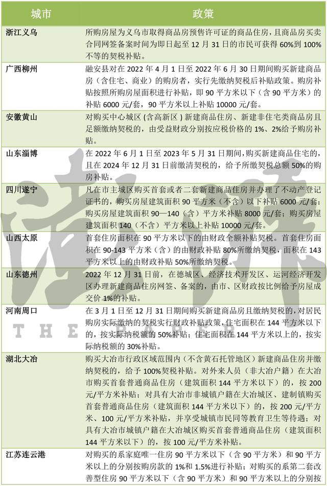 在放开限购、限售、降低首付款等政策外,对消费有着直接带动作用的购房补贴、契税减免、购房消费券也在多地频现。 据澎湃新闻不完全统计,5月以来,包括浙江义乌、广西柳州、安徽黄山、山东淄博、四川遂宁、山西太原、山东德州、河南周口、湖北大冶、江苏连云港、四川泸州、四川资阳、四川乐山、湖南岳阳、湖北天门、江西上饶等近20城发布契税及购房款补贴,带动楼市需求。 以浙江义乌为例,5月26日,义乌市房地产市场平稳健康发展领导小组办公室发布《义乌市2022年购房契税补贴实施细则》。该细则规定,所购房屋为义乌市取得商品房预售许可证的商品住房,且商品房买卖合同网签备案时间为即日起至12月31日的市民可获得60%到100%不等的契税补贴。其中,即日起至9月30日期间购买首套商品住房,按所缴契税地方留存部分100%给予补贴;购买二套及以上商品住房,按所缴契税地方留存部分80%给予补贴。凡在10月1日起至12月31日期间,购买首套商品住房,按所缴契税地方留存部分80%给予补贴;购买二套及以上商品住房,按所缴契税地方留存部分60%给予补贴。 山西太原也发布了类似政策。太原规定,自2022年5月20日起,首套住房面积在90平方米以下的由财政全额补贴契税。首套住房面积在90-143平方米(含)的由财政补贴80%所缴纳契税,面积在143平方米以上的由财政补贴50%所缴纳契税。 除了契税补贴,也有不少城市给出更为实际的购房款补贴、购房消费券等。其中有城市最高以购房款2%进行补贴。 拿江苏连云港来说,连云港市住建局于5月17日发布《连云港市市区支持居民刚性和改善性住房消费实施细则》,2022年5月18日至2022年6月30日期间内,对市区(不含赣榆区)居民购买新建的家庭唯一住房和第二套改善性住房予以补贴。其中,对购买的系家庭唯一住房90平方米以下(含90平方米)和90平方米以上的分别按购房款的1%和1.5%进行补贴;对购买的系第二套改善型住房90平方米以下(含90平方米)和90平方米以上的分别按购房款的1%和2%进行补贴。 四川乐山的政策显示,凡是购买首套新建商品住房的,享受每套购房补贴8000元。凡是购买第二套新建商品住房的,享受每套购房补贴12000元。 易居研究院智库中心研究总监严跃进表示,从当前各地出台的政策来看,除了金融和行政调控政策以外,这一轮楼市调控中也有很多城市通过契税补贴、购房补贴等财政手段来提振楼市需求。 58安居客房产研究院分院院长张波指出,买房补贴主要分两类,一类是阶段性普惠政策,大都是为了提升房地产市场热度,给予契税减免,针对的人群范围广,属于政策放松手段之一,不同城市间对于市场热度的提升效果差异度较大。另一类是针对特定人群的补贴,包括人才购房补贴,多孩家庭补贴等,这类政策往往是针对特定人群,并且意图通过房产政策带动人才落户、生育率提升效果。 张波认为,从目前楼市整体放松的环境来看,各地的购房补贴大都属于各地调控放松“组合拳”的组成部分,政策单一对市场释放的效力相对有限,和其他调控放松政策形成合力,会对市场形成一定影响力。 中指研究院指数事业部市场研究总监陈文静指出,2022年以来,多地因城施策维稳房地产市场。其中,多地发布契税及购房款补贴相关政策,降低购房者置业成本,有利于释放潜在刚需及改善型需求,提升市场活力,对稳定房地产市场发展有着积极作用。但从目前政策效果上看,部分城市补贴力度不大,对市场提振效果有限,发放购房补贴结合更多优化政策,或可更好地发挥效用。 |