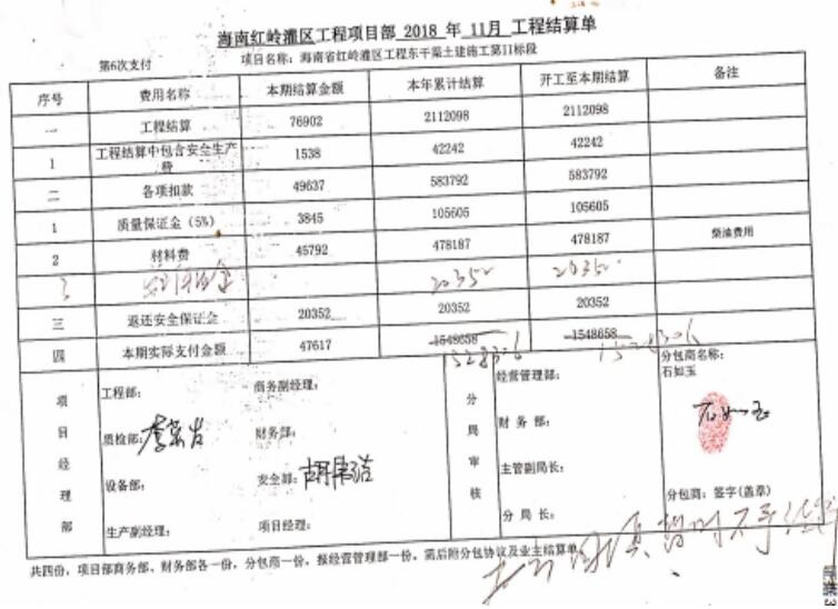 2021年11月1日,定安县人民法院作出民事判决:一、被告中国水利水电第六工程局有限公司在本判决生效之日起十五日内向原告石如玉、海南水安建筑工程有限公司支付工程施工各种费用合计人民币2451089元;二、被告中国水利水电第六工程局有限公司在本判决生效之日起十五日内向原告石如玉、海南水安建筑工程有限公司退还质保金105600元;三、驳回原告石如玉、海南水安建筑工程有限公司的其他诉讼请求。