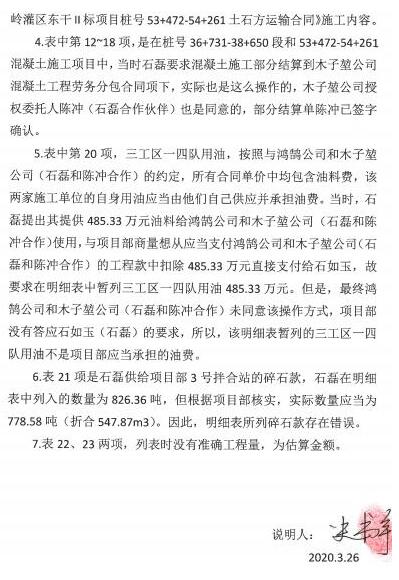 二是石如玉和水安公司依据《对账明细表》主张各项费用合计为人民币20929180元,并没有证据支持。石如玉和水安公司作为施工方,按照谁主张谁举证的原则,石如玉和水安公司应当承担证明其所主张的人民币20929180元工程费用实际发生并具备结算支付条件的举证责任。石如玉和水安公司依据《对账明细表》主张各项费用中,对中水六局已经明确认可的14244979元的费用(包含双方已经签订结算单以及中水六局自行承认的费用,未扣减中水六局主张应扣减的支付给赵泽星破碎锤设备租赁费10万元、支付给岑选江破碎锤设备租赁费26万元、支付给吕扬锋设备租赁费21.4195万元、支付堆放的土石料外运及复垦费用5.0863万元)应于认定,但对于双方有争议,又没有其他证据证明实际产生该费用的情况下,对石如玉和水安公司所主张的其他的各项费用应不予认定。