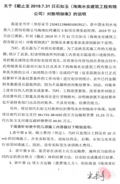 2019年8月24日,商务副经理史书宇通过微信向石磊微信发送了《对账明细表》,该《对账明细表》上没有石如玉签名和水安公司盖章,没有中水六局的项目经理、生产经理崔国印、蔡洪亮、蔺新龙、丁文胜以及中水六局的工程部、财务部、安全部、质检部、设备部、商务部等人员签字,也没加盖中水六局的项目章。 2020年3月26日,史书宇出具《关于<截止至 2019.7.31日石如玉(海南水安建筑工程有限公司)对账明细表>的说明》,阐明当时是石磊为了向项目部请款,为反映其实施工作的大致金额,统计了此表,表中已付金额财务数据是石磊提供的,因为不是最终的对账结算单,该明细表既不是结算单也不是财务部门出具的对账单,不具有对账、结算的效力。