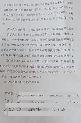 上海市、松江区都提出减免房租6个月,我们为啥只有一个月 尊敬的领导们好: 我们是松江区中山苑商业广场的租户,现特向领导反映我们在房租减免方面遭遇到的问题,请求领导们在百忙之中核实处理为谢! 2022年5月21日,上海市人民政府印发《上海市加快经济恢复和重振行动方案》提出:扩大房屋租金减免范围。对承租国有房屋从事生产经营活动的小微企业和个体工商户,免予提交受疫情影响证明材料,2022年免除6个月房屋租金。鼓励引导商业综合体、商务楼宇、专业市场、产业园区、创新基地等非国有房屋业主或经营管理主体,向最终承租经营的小微企业和个体工商户给予6个月房屋租金减免。 6月20日,《松江区加快经济恢复和重振的实施方案》发布,第一条就是扩大房屋租金减免范围。 这些文件很清楚说的向最终承租的商户减免6个月。今年的疫情,封控了我们2个多月,生活之艰辛不与人说。真心感谢政府出台了这么好的减免政策。 ![]() 商户去上海宏芮公司协商 ![]() 现在的租赁合同 ![]() 以前的租赁合同 然而我们这些承租中山苑商业广场多年的商户却得不到这个减免政策。目前和我们签订租赁合同的上海宏芮公共租赁住房运营有限公司告诉我们,中山街道办的政策是补贴三个月,且按照每平方米1.6元每天的租金补贴。可我们和宏芮公司的租赁合同是每平方米每天是3-7元,还有物业费是每平方米每天1元啊!这样算来他们补贴给我们的还不到一个月呢!这点补贴对于我们来说真是杯水车薪,只能是聊胜于无,打发叫花子了啊!于是我们多次找公司请求按照市区政府政策来补贴,可宏芮公司不予理睬。 更令人气愤的是,宏芮公司在6月23日发来租金缴款通知书,要求我们在6月30日之前缴纳今年4月到明年4月的的全额租金。对于减免租金的问题,宏芮公司明确答复是先缴纳完租金后说!为什么不按照文件政策让我们缴纳半年的租金呢,这样岂不是更方便快捷吗?!看来宏芮公司是不执行市区二级政府的文件政策,这样能促进咱们上海是松江区的经济恢复和重振吗? 经查询,上海宏芮公共租赁住房运营有限公司法定代表人卢德福也是上海福浦实业发展有限公司法定代表人 我们是小本服务经营者,疫情让我们生活困难,但疫情让我们你看到了党和政府的和关爱!我们希望党和政府的关怀能得到落实,不让黑心企业坑害我们这些外来求生活的商户,也别让一小部分人来损害党和政府的公信力! 真心感谢领导们的关注和关爱! 商户签字: |