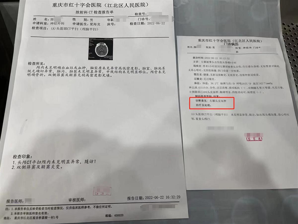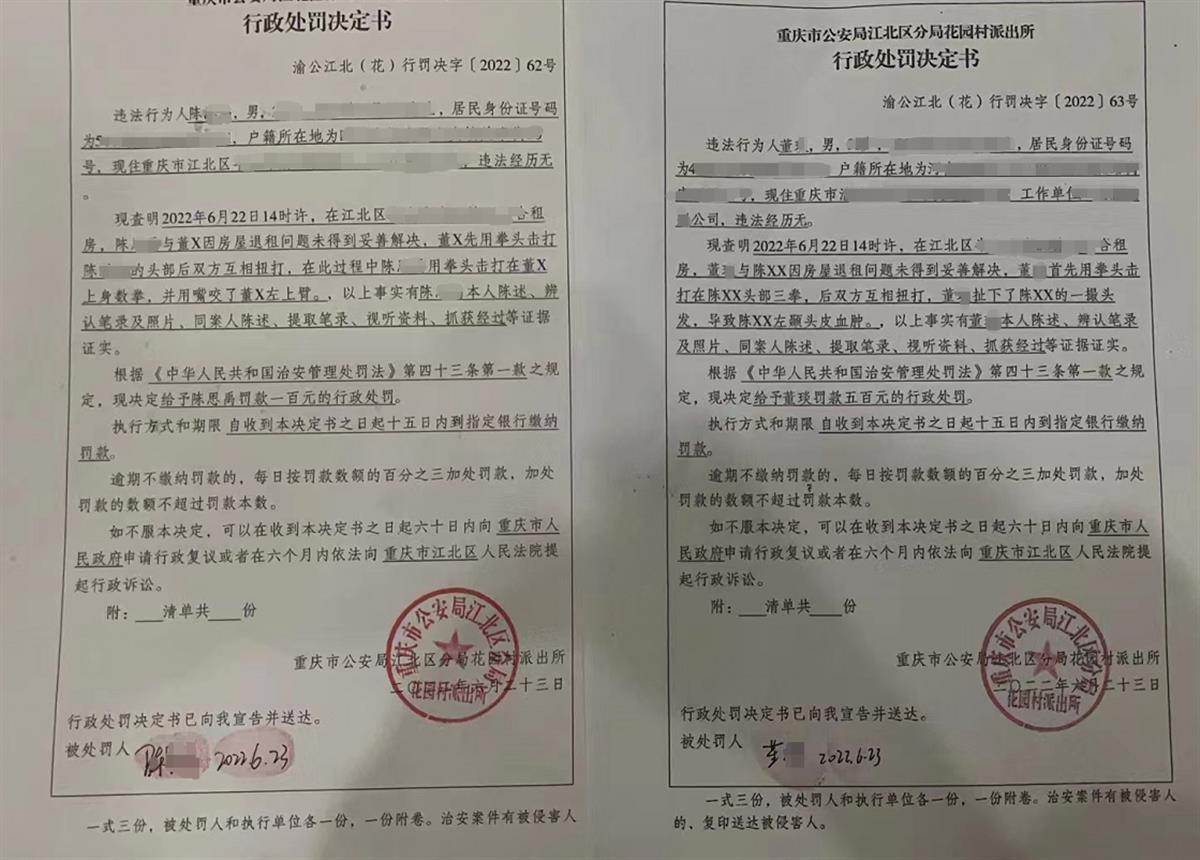 极目新闻记者 丁伟 李贤诚 6月22日,正与女友在出租屋内睡觉的重庆市民陈先生,遭遇了惊魂一幕。 陈先生称,当天,中介人员在未得到允许的情况下,擅自闯入卧室,掀开自己及其女友的被子,要求他们搬离房间。期间,中介人员还殴打了自己,最后导致双方互殴。 26日,中介工作人员董某回应极目新闻称,当时屋内光线昏暗,自己没有发现床上还有陈先生的女友,他已经认识到了错误,但陈先生属于违约在先,他“被套路”,这件事情不能断章取义。 租客陈先生与中介发生冲突 据悉,双方因房屋退租问题未得到妥善解决,从而引发矛盾。6月23日,警方根据治安管理处罚法相关规定,对陈先生和董某分别给予罚款100元和500元的行政处罚。 租客称出租屋内遭中介掀被殴打 6月22日下午2时许,租住在重庆市江北区一小区的陈先生与女友正在家中睡觉,突然间,有4名中介人员以催缴房租为由,进入其卧室内。陈先生称,其中1人还在其女友没穿衣服的情况下,强行掀被子,还殴打自己。 极目新闻记者从陈先生提供的视频中看到,事发时屋内光线昏暗,屋外传来一阵急促的敲门声,随后房门被打开。一名戴眼镜的男子朝屋内看了看,询问陈先生当天交不交房租,并称当天交不了房租,房子肯定住不了。陈先生以房租未到期为由予以反驳,并称自己不续租了。在听到陈先生不续租的回答后,那名戴眼镜的男子开始将陈先生房间内的鞋架扔到屋外,并上前暴力拉扯陈先生所盖的被子,这时,视频中传来一名女子的叫声,陈先生起身反抗却被戴眼镜的男子打倒后按倒在床上,随后视频画面一片漆黑,传来双方争执的声音。 中介人员董某扔陈先生物品 陈先生女友拍摄的另一段现场视频显示,穿着内裤的陈先生与戴眼镜的男子抱打在一起,随后陈先生被推倒在床上,期间,戴眼镜的男子让陈先生的女友把手机收起来。极目新闻记者注意到,视频中,还有其他三名男子进入到房间内,但当时并未动手。 事后,陈先生报警处理此事。极目新闻记者从警方出具的两份行政处罚决定书中了解到,陈先生与戴眼镜的男子董某因房屋退租问题未得到妥善解决,董某首先用拳头击打陈先生头部三拳,后双方互相扭打。在此过程中,陈先生用拳头击打在董某身上数拳,并用嘴咬了董某左上臂,而董某则扯下了陈先生的一撮头发,导致陈先生左颞头皮血肿。 警方出具的行政处罚决定书 6月23日,警方根据治安管理处罚法相关规定,对陈先生和董某分别给予罚款100元和500元的行政处罚。 双方冲突因房屋退租矛盾所致 6月26日,当事人陈先生向极目新闻记者讲述了发生此次冲突的原委。 “我是今年4月18日和中介签的一年的租房合同,交了3个月的房租,还有1个月的押金,按理说应该是到7月18日,这一个季度的房租才算到期。可在本季度房租到期前一个月的6月19日,房屋管家就提出要缴纳下个季度的房费。”陈先生说,如果6月份不交下个季度的房租,中介方就要求自己提前一个月搬走,对此他不能接受。6月20日,双方因此事协商未果报警处理,但警方让私下解决。之后两天,就发生了中介闯入卧室的事情。 极目新闻记者从陈先生与中介签订的租房合同中看到,双方约定的租赁起止时间为2022年4月18日至2023年4月21日,租金付款方式为押一付三,陈先生应根据每期固定18号收租(每期提前一个月)的支付方式,分别于2022.04.18,2022.6.18,2022.9.18,2022.12.18,2023.3.18支付该房屋租金及每月周期费用。 租房合同细则 此外,合同中约定,租赁期内租客应无需甲方通知,按时向指定账户汇入房租,如逾期3日未支付房租,则构成违约,甲方有权单方解除本合同,租客应在甲方通知之日搬离此房,若未搬离则视为租客自动放弃屋内设施及物品所有权,甲方有权单方收回房屋接纳新租户入住,租客所缴纳保证金和未住满房租不予退还。 对于上述合同规定,陈先生称,当时租房时比较匆忙,没有细看具体条款。但他认为,对方制定的合同属于不利于租客条款,合同的合理性存疑。此外,对方冲进房屋扔东西的行为不合法,这种暴力行径不能接受。 中介人员称被租客“套路” “是他违约在先,我是被套路了。”26日上午,极目新闻记者联系到了中介公司的员工董某。据董某称,早在冲突发生之前的6月20日,公司代表和陈先生已经到当地派出所就房租到期缴纳一事进行协商,但双方未达成一致意见。 “22号下午,我在房间门口敲门等待5分钟,他隔着屋门,对我进行了各种人格侮辱和言语辱骂,故意激怒我。”董某说,当他准备开门进屋时,发现门并没有上锁,门打开后,他并没有直接进屋,而是站在门口和陈先生理论,“他趁着屋内光线黑暗,故意挑逗,引诱我做出了过激行为,并偷偷地录像。” 对于董某所称的辱骂行为,陈先生则表示,对方每次敲门,自己都有作出回应,并未对其辱骂,也没有允许对方进入房间。 董某说,因为屋内黑暗,去摸门口灯的开关,没有找到,“我去拽被子时候,才发现床上还躺着一个女孩,而不是我知道床上有一个女孩才去拽被子的,这个时间前后顺序很重要。”董某说,陈先生看到他拽被子后,就立马扑过来,随后双方扭打在一起。 董某还表示,陈先生的头发掉了一撮,是因为当时陈先生扑上来后,使劲咬他的手臂,在受痛后自然反应就拽了陈先生的头发,虽然此事已经过去几天,但胳膊上的咬人牙痕依然可见。 租客陈先生医院检查报告 “在警察的协调下,我已答应退还陈先生的押