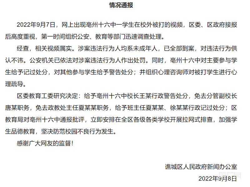 亳州通报十六中一学生校外被打事件:免去分管副校长职务 央广网亳州9月8日消息(记者 汪称)据亳州市谯城区人民政府新闻办公室8日发布的通报消息,2022年9月7日,网上出现亳州十六中一学生在校外被打的视频,区委、区政府接报后高度重视,第一时间组织公安、教育等部门迅速调查处理。 经查,相关视频属实。涉案违法行为人均系未成年人,已全部到案,对违法行为供认不讳。公安机关已依法对涉案违法行为人作出处罚。同时,亳州十六中对主要参与学生给予记过处分,对其他参与学生给予警告处分;并组织心理咨询师对被打学生进行心理疏导。 区委教育工委研究决定:给予亳州十六中校长王某行政警告处分,免去分管副校长唐某职务,免去政教处主任夏某某职务,给予班主任夏某某、徐某某行政记过处分;区教育局对亳州十六中通报批评,立即安排在全区各级各类学校开展拉网式排查,加强学生品德教育,坚决防范校园不良行为发生。 亳州谯城区情况通报(央广网发 图片来源:谯城区人民政府新闻办公室) |