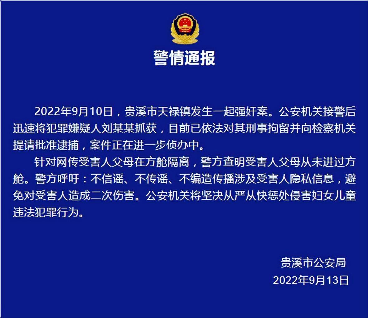 “江西一女孩在父母隔离期间被强奸”?当地警方通报 大皖新闻记者 孙召军 9月13日,江西省贵溪市公安局发布通报:2022年9月10日,贵溪市天禄镇发生一起强奸案。 公安机关接警后迅速将犯罪嫌疑人刘某某抓获,目前已依法对其刑事拘留并向检察机关提请批准逮捕,案件正在进一步侦办中。 针对网传受害人父母在方舱隔离,警方查明受害人父母从未进过方舱。警方呼吁:不信谣、不传谣、不编造传播涉及受害人隐私信息,避免对受害人造成二次伤害。公安机关将坚决从严从快惩处侵害妇女儿童违法犯罪行为。 9月13日上午,网上流传一起案情,江西省贵溪市天禄镇流桥村发生一恶性强奸案。 网上流传的信息称,犯罪嫌疑人刘某某为当地村干部刘某宗。大皖新闻记者通过企查查查询到,贵溪流桥力富建筑劳务有限公司法定代表人正是刘某宗,记者拨通企查查上留下的号码,对方表示,他并不是刘某宗,“刘某宗这个人我当然知道,这个事村里都知道,前天就都知道了,但我是村里退休干部,我不能乱讲的,等公安部门的通报吧。” 下午两点,大皖新闻记者又联系到天禄镇镇政府,一位工作人员告诉记者,“一切请以公安机关通报为准,现在能告诉你的就是他(刘某宗) 第一时间就已经被刑拘了。” |
