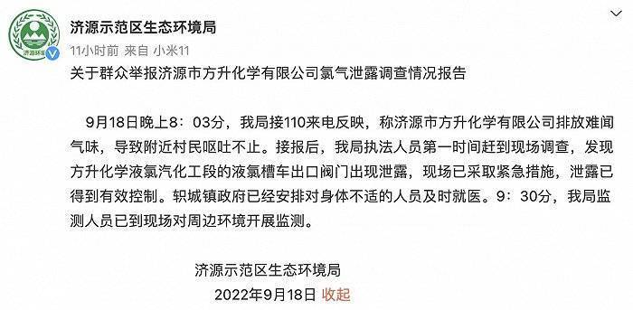 河南济源示范区一公司氯气泄露,调查情况公布 @济源示范区生态环境局 微博通报群众举报济源市方升化学有限公司氯气泄露调查情况报告:9月18日晚上8:03分,我局接110来电反映,称济源市方升化学有限公司排放难闻气味,导致附近村民呕吐不止。接报后,我局执法人员第一时间赶到现场调查,发现方升化学液氯汽化工段的液氯槽车出口阀门出现泄露,现场已采取紧急措施,泄露已得到有效控制。轵城镇政府已经安排对身体不适的人员及时就医。9:30分,我局监测人员已到现场对周边环境开展监测。 |