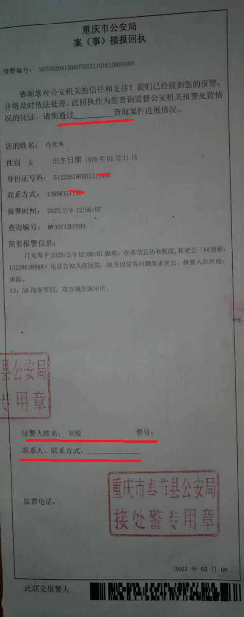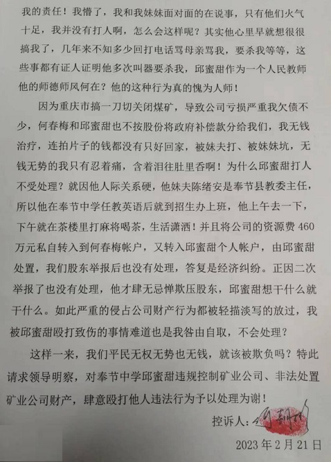 重庆奉节中学教师邱密甜殴打他人缘何逍遥法外 ![]() 尊敬的领导: 我叫何朝彬,奉节县永安镇居民,巫山县大石沟煤矿股东。身份证号:51222619680923****手机:1322863****.现向领导反映我被奉节县中学老师邱蜜甜殴打致伤情况,请求领导过问,依法依规处理。 2023年2月9日上午,我和姝姝何春梅(公司法人)、妹夫邱蜜甜、公司股东卢进才、我父亲何登元在地王广场露天茶馆第一个包间商量处理公司帐务问题,我和何春梅面对面交谈,说到一次转型资金分配时何春梅声音大起来捶桌子并指着骂我,我轻轻推了她一下,对她说今天是处理问题,别骂人。话还没有说完邱蜜甜就突然拿起桌上的杯子砸向我头部,还喊着老子砸死你,我后脑勺当即血流不止,幸好卢进才拉开邱蜜甜,我父亲立马堵住了我,我才没有再被邱蜜甜欧打,要不然我脑袋被砸成什么样就真不知道。之后我父亲立马把我送到奉节县普恵医院紧急治疗,脑袋缝了三针。 我给外地的妻子打电话,她当即电话报警了,之后奉节县第一派出所民警到医院来,叫我做完治疗后到派出所去,我去了问完事情的经过和指认了现场打我时留下的茶杯。 2023年2月14日上午我去派出所问这个事情怎么样处理时,可是民警说是我打我妹妹,邱蜜甜当然得打我啊,并警告要追究我的责任!我懵了,我和我妹妹面对面的在说事,只有他们火气十足,我并没有打人啊,怎么会这样呢?其实他心里早就想很狠狠搞我了,几年来不知多少回打电话骂母亲骂我,要杀我等等,这些事都有证人证明他多次叫器要杀我,邱蜜甜作为一个人民教师他的师德师风何在?他的这种行为真的愧为人师! 因为公司亏损严重我欠债不少,何春梅和邱蜜甜也不按股份将政府补偿款分给我们,我无钱治疗,连拍片子的钱都没有只好回家,被妹夫打、被妹妹坑,无钱无势的我只有忍着痛,含着泪往肚里呑啊!为什么邱蜜甜打人不受处理?就因他人际关系硬,他妹夫陈绪安是奉节县教委主任,所以他在奉节中学任教英语后就到招生办上班,他上午去一下,下午就在茶楼里打麻将喝茶,生活潇洒!并且将公司的资源费460万元私自转入到何春梅帐户,又转入邱蜜甜个人帐户,由邱蜜甜处置,我们股东举报后也没有处理,答复是经济纠纷。正因二次举报了也没有处理,他才肆无忌惮欺压股东,邱蜜甜想干什么就干什么。如此严重的侵占公司财产行为都被轻描淡写的放过,我被邱蜜甜殴打致伤的事情难道也是我咎由自取,不会处理? 这样一来,我们平民无权无势也无钱,就该被欺负吗?特此请求领导明察,对奉节中学邱蜜甜违规控制矿业公司、非法处置矿业公司财产,肆意殴打他人违法行为予以处理为! 控诉人:何朝彬 2023年2月21日 附相关法规: 《中华人民共和国治安管理处罚法》第九条 对于因民间纠纷引起的打架斗殴或者损毁他人财物等违反治安管理行为,情节较轻的,公安机关可以调解处理。经公安机关调解,当事人达成协议的,不予处罚。经调解未达成协议或者达成协议后不履行的,公安机关应当依照本法的规定对违反治安管理行为人给予处罚,并告知当事人可以就民事争议依法向人民法院提起民事诉讼。 《中华人民共和国治安管理处罚法》第四十三条 殴打他人的,或者故意伤害他人身体的,处五日以上十日以下拘留,并处二百元以上五百元以下罚款;情节较轻的,处五日以下拘留或者五百元以下罚款。 有下列情形之一的,处十日以上十五日以下拘留,并处五百元以上一千元以下罚款: (一)结伙殴打、伤害他人的; (二)殴打、伤害残疾人、孕妇、不满十四周岁的人或者六十周岁以上的人的; (三)多次殴打、伤害他人或者一次殴打、伤害多人的。 ![]() 头部被打流血 ![]() 医院出具的诊断书 ![]() 派出所当天出具的受案回执
