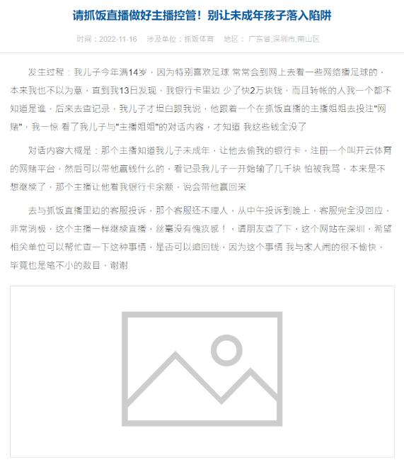 | 直播乱象!抓饭直播内涉赌主播高达数十人!受骗民众上千人! 抓饭直播注册于深圳市思佰莱网络科技有限公司,网站显示登记地址于深圳市南山区粤海街道滨海社区海天二路19号盈峰中心1207,但该社区回复说,此公司从未在此办公过,问了抓饭直播客服,回复得到是实际经营地址在北京市朝阳区,真假未知。 本人于2022年4月起因观看足球比赛接触到了“抓饭直播”这个平台,本想着看看足球听听比赛分析,听主播的话以为加入QQ粉丝群是讨论赛事,想不到一加入是拉我去注册网赌平台,深入去了解发现这些主播全是在替境外网赌推广,无一例外! 他们都是使用”口播”,或”公频”方式让观众添加联系方式,用首单包赔或充值福利等引导观众去注册网赌平台,进一步了解,这些主播收受一场200-300元不等代价,替网赌集团招揽赌客,抓饭直播则是透过这种方式,增加流量 收取”网赌集团”替这些主播刷高排名的”礼物费”。 下述举报可佐证所言为实。 举报1:自从2022年9月8日起,一名为章章的主播就开始在抓饭直播推广网赌平台 其中推广的网赌平台有:BOB体育、博鱼体育、金爵体育。 共换过6次帐号,分别为:2022年9月8日-章章不在嘛;2022年9月16日-帅蛋哥哥;2022年9月21日-小曼曼解说;2022年9月23日-章章推球;2022年9月27日-章章在不在;2022年11月20日-神哥s。 ![]() 推广网络赌博方式如图 "章章推球"此帐号在公频上发送"756013" 当观众加入后就会被推广"BOB网络赌博平台"。 方式如下。 并使用口述方式,回答该观众说有的哥哥,等助理加你即可,此时抓饭直播的管理员也有在场,将 帅蛋哥哥 禁言之后,章章马上使用"神哥s"账号推广网赌,该管理员并未做出阻止或禁播动作。 举报2:2022-11-19 14-48-51 ,抓饭一名为:”橘子”的主播 使用主播名为:“世界杯起飞”的直播间,进行播放足球比赛,解说中途,该名主播口述说:等一会我们换到卡塔尔世界杯的直播间去播,因为这个直播间被禁言,所以换到另一个直播间去播,幸好直播间多!过了3分钟之后真的更换到名为“卡塔尔世界杯i”直播间。 换到名为卡塔尔世界杯i的直播间后,该名主播随即在公频上发QQ号610350353,并推广天博体育网赌平台。 此“橘子”使用的账号如下:世界杯起飞、卡塔尔世界杯i。 直播间网址: 举报3:自从2022年8月25日起,一名为”秀哥”的主播就开始在抓饭直播推广网赌平台 ![]() 其中推广的网赌平台有:欧宝体育、博乐体育、龙珠体育。共换过25次帐号。 上述直播间,都可看见此名"秀哥”,都有把该名称打在直播间标题上,且声音相同,推广的网赌信息相同并且粉丝群有多数相同,群管理也一样,甚至在抓饭直播中送礼的”主播助理”都是同一人,抓饭让一名主播能开17个账号并且这还是有限制的状况下,观众没记录到的肯定只多不少。 举报4:在百度贴吧中.抓饭直播吧/抓饭TV吧 内就有非常多人寻找"兼职”或者境外网赌集团会在上面招聘”主播” 用播一场赛事200-300人民币不等的代价,招聘国人当主播招揽中国赌客! 抓饭直播吧、抓饭TV吧。 具体要求: 能让社会大众知道并识别这种直播带赌是非法的,容易掉入陷阱 让抓饭直播知道法治的观念,不要盗播腾讯NBA与抖音和咪咕的世界杯转播 让国家与大众能重视这个问题,打击境外网赌产业链,别让中国人在家工作替”境外网赌”招揽赌客 让抓饭直播做好控管,抓饭直播上面写客服在线时间为中午11点到晚上8点,但运营时间为24小时,根本无法控管,请让抓饭直播能依照国家规定去遵守,并能时刻遵守法律,学习法治。 避免让未成年使用,若使用要严加控管,别再让这些主播误导青少年去网赌。 抓饭直播内的主播曾被网上让人投诉,内容为骗取未成年孩童。 根据长期观察,抓饭至少有400多间直播间在推广网赌平台,其中这些主播推广的平台几乎都是差不多相同,甚至有不同主播,在推广相同的QQ粉丝群号,可见是有组织性的,相同的点还有,这些主播都会说是”亚博旗下”,或张信哲代言”欧宝体育"等等话术诱赌。 400多间并非虚言,有掌握实际录像与对话证据,但档案过大,所以提及一下,如有需要可发送。 统计,BOB体育推广主播53人,开云体育推广主播45人,天博体育推广主播53人 占了总数至少一半。 |