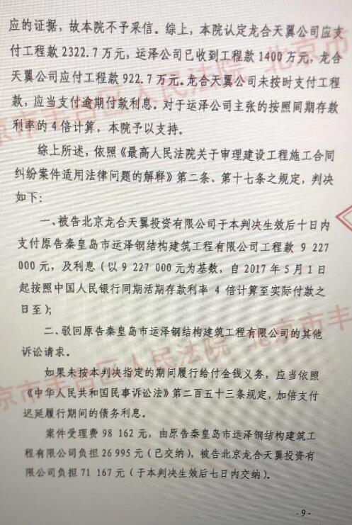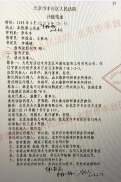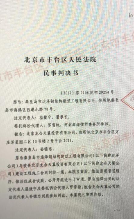 | 运泽公司法人向有关部门实名举报投诉: 公司因施工结束7年未得八千余万剩余工程款已频临倒闭应追责 文 李辉 夏至节气,酷暑难耐。而秦皇岛市运泽钢结构建筑工程有限公司(简称运泽公司)法定代表人温捷宁先生和员工及合作单位职工烈日炎炎下近日向媒体和有关部门实名举报投诉时却心情更加沉重。他们举报投诉:7年前,2016年运泽公司、大连装修公司、北京土建公司及施工人等在北京市丰台区马家堡施工龙合公寓工程,至今没有得到剩余工程款,使这些公司及施工人等均债台高筑业务瘫痪难以为继频临倒闭。他们心急如焚地希望媒体和有关部门关注此事,迅速对所反映问题予以核查,依法依规给予公众处理,以讨还自身的公道和血汗钱,把自身从绝境中解救出来,继续为国家建设做出新的奉献。 6月28日,媒体据此举报投诉材料请北京市丰台法院信访部门核实情况,该院信访部门表示将向院领导反映,使投诉者得到些许安慰。之后几天,该法院信访部门电话无人接听。 投诉人反映:法官伪造莫须有的开庭、庭审笔录和判决书 “未审而判”致政府调解陷入绝境,致施工单位工程款结算、支付陷入绝境! 据悉,优质企业运泽公司成立于2000年。2017年前,公司业务遍布河北、内蒙、辽宁、甘肃、贵州、江苏等地;公司业绩辉煌,曾经完成跨度69米的居当时全国最大跨度钢屋架施工、曾经完成直径8.5米的居当时全国最大直径钢管的施工、曾经完成第一个由中国人设计的世界级蹦极施工、曾经完成中国北方第一座悬链线铁索桥、曾经完成无数个工程业内引以为傲的全国第一的工程;施工高峰期公司每年解决300人及以上就业,公司纳税贡献巨大;公司经过多年奋斗,公司在10年前在秦皇岛市购置土地建设了属于公司自己的花园式园区,园区有土地几十亩、园区有办公楼、数据楼、综合楼、等建筑及无数建筑小品,园区楼宇建筑面积达到2万平方米。公司一派繁荣,公司成为业内知名企业优质企业…… ![]() 马家堡工程外景影印件 然而,18岁即成为中共党员的运泽公司法定代表人温捷宁反映:运泽公司完全没有想到,在2016年参与的一起北京工程而陷入绝境。2016年5月8日,北京市龙合天翼投资有限公司(以下简称龙合公司)与运泽公司签署龙合公寓工程施工合同。施工地点北京市丰台区马家堡地铁站西侧50米,施工内容是7层楼龙合公寓钢结构主体的钢梁、钢柱、楼板等施工。2016年10月8日,运泽公司完成合同任务及追加任务离开工地。 2017年3月下旬,丰台区政府认为龙合工程不合理,关闭工地。2017年8月, 丰台区政府工作组要求各施工单位去法院起诉。2017年10月,运泽公司与多家施工单位去丰台法院起诉。2019年2月26日,运泽公司得到法院判决书,见《北京市丰台区人民法院(2017)京0106民初29254号民事判决书》。 运泽公司法定代表人投诉,这个判决书所依据的开庭、庭审笔录根本子虚乌有,所以这是伪造判决书。因为这个伪造判决书没有判决依据。这个伪造判决书导致运泽公司工程款结算、支付陷入绝境,是至今所有工人得不到人工费、所有施工单位得不到工程款、政府工作组多次准备给工人施工单位解决人工费工程款而不能解决与支付的根本原因。 投诉人用确凿证据指出判决书的种种伪造。 运泽公司法定代表人、其它投诉人及权威司法人士指出:伪造判决书对应的《北京市丰台区人民法院民事一审诉讼卷宗主卷·(2017)京0106民初29254号·56页、57页、58页的开庭笔录》显示:北京丰台法院法官伪造了开庭,法官伪造了质证笔录,法官伪造了判决书,并将可能由此引发的法律后果甩锅于当事人,严重损害了司法的公信力! 伪造的开庭笔录影印件 丰台区人民法院(2017)京0106民初29254号判决书开篇即称“原告运泽公司的法定代表人温捷宁及委托诉讼代理人罗雪艳(律师),被告龙合天翼公司法定代表人孙德忠到庭参加诉讼。”完全与事实不符。 法院文件显示:盖有丰台区人民法院公章的庭审笔录上的时间白纸黑字写道“2018年6月13日下午15时50分。”这是弥天大谎。 ![]() 火车票影印件 实际情况是:①温捷宁的火车票证明,温捷宁此时正在乘坐D6620次动车,由秦皇岛驶往北京,此车的开点时间是当日15时17分,其座位号为6车厢18A;②对方孙德忠被羁押昌平看守所(有羁押登记为铁证);③特别值得一提的是温捷宁的代理人律师罗雪艳,根本就没来北京。她看到丰台法院的判决书后非常震惊和愤怒,简直不敢相信自己的眼睛,反问到“北京的法院还能造假?”庭审笔录与判决书竟然将她的名字也写错了(本来是雁,却写成了艳)。 这个子虚乌有的“判决书”在事实认定上,将整体工程结算进行拆分,致使合法权益得不到充分救济。 判决前,法官说:丰台法院是工作组成员单位、自己是工作组成员,他自己与法院院长多次去工作组开协调会!很多人知道这个事实。①法官发放判决书时,法官说:判决书中1-6楼工程款的问题在工作组协调解决而不用上诉,判决书中7楼工程款的问题在丰台法院起诉!因此,没有对判决书上诉!很多人知道这个事实。②工作组调解前,工作组与法院很多法官要求各家施工单位撤诉进行调解;所以,运泽公司7楼起诉状的结果是:只有7楼工程造价鉴定报告而没有7楼起诉状的判决书,同样,大连装修公司、北京土建公司的起诉状的结果也是:只有工程造价鉴定报告而没有起诉状的判决书。目前还是