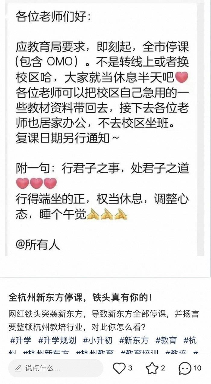 近日,新东方(NYSE:EDU)杭州线下中心突然全面关闭,起因是抖音网红“铁头惩恶扬善”(下称铁头)举报杭州新东方违规补课。 8月8日晚,杭州家长林纾告诉界面教育,其孩子在杭州新东方接受高中学科辅导,周一突然接到停课通知,目前尚未复课。虽然铁头没有在她孩子所在校区闹事,但全杭州的线下学习中心都停了。 8月7日,界面教育以家长身份咨询杭州新东方工作人员,对方表示:“当天下午临时接到教育局通知,全杭州的校区都停课了。”截至发稿,新东方总部未回应界面教育。 今年4月起,铁头持续发布多条“打假”视频,点赞最高的是三亚海鲜、消失的美容院等视频。目前,该网红发布了66条视频、不到半年涨粉超300万。 铁头举报补课的动机也不乏有吸引眼球、赚流量的嫌疑。7月25日,铁头连续发布两条主题为“教培行业补课怎么看”的街头采访为铺垫,点赞均超两万。其“打假”教培系列流量最高的视频是“勇闯新东方”,点赞数超十万。 8月4日,铁头来到杭州新东方的一家学习中心,以家长身份询问是否可以进行初高中学科培训,工作人员回应称,目前高中可以进行语文、数学、英语补课,初中班目前是线上线下各一半。 视频中,铁头先是质疑机构违规补课,随后拨打110报警称新东方违规补课,要求退还家长补课费用,取缔补课行为,对该公司行政罚款。当天,该校区拉闸关电,并遣散师生回家。 8月6日、7日,铁头连续发布相关视频,并多次向派出所、市场监督管理局、教育局举报新东方,称教育局周五前会答复相关问题。 此外,铁头会在每条视频的评论区求粉丝打赏,其简介显示,“惩恶小金库还剩余29469元,扬善已使用54000元”。 铁头认为,新东方进行学科类补课违反了教育部和浙江教育厅关于的“双减”相关规定,属于违规违法行为,造成教育不公平。其在该视频中表示,要让补课行为在浙江断根,“如果这家店敢开,我天天来,杭州全区的新东方、学而思,还有重点高中提前补课的行为,我全部都会去。” 对此,林纾的看法是:“家长和学生都同意补课,只有铁头不同意。” “学校一节课四十分钟,老师既要讲作业又要上新课,有些细节容易忽略。”林纾认为,补习班的师资好,时间充足,讲课也更细致,氛围更轻松,她希望可以尽快复课。 按照“双减”指导文件,暑期义务教育阶段的学科培训被明确禁止,高中阶段参照义务教育阶段执行,但参照到何种程度,尚没具体文件作为指引。 中国民办教育协会负责人刘林此前接受界面教育釆访时曾表示,高中教育的校际、区域差异很大,应先由各地根据本地实际情况,开展不同形式的试点,总结经验基础上再全国范围实行。 “双减”政策落地两年以来,家长的教育焦虑并未消失,地下补课市场盛行。许多家长在社交媒体上表示,补课风险上涨,补课费用甚至达千元每小时,家庭教育支出有所上升。林纾孩子在杭州新东方补习高中的全科内容,学费160元/节。 21世纪教育研究院院长熊丙奇表示,应慎重出台针对高中学科培训的监管政策。如果对高中学科培训机构采取和义务教育学科培训机构一样的监管方式,无疑具有收缩效应,会加快学科类培训机构的离场,更多从业人员失业,与此同时,培训也会走到地下。 (应受访者要求,文中林纾为化名) (界面新闻记者|陈振芳) |