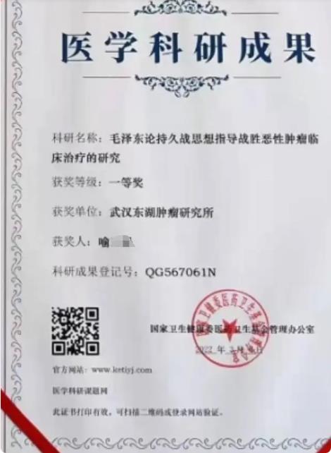 喻某获颁医学成果奖,国家卫健委称“无此机构”(受访者供图) 王女士称,给母亲办理后事期间,有医护人员提醒她遇到了骗子。7月底,她向武汉相关部门投诉,武昌区卫健委工作人员告诉她,喻某没有任何医疗相关的许可证,也没有制药、售药资质,涉嫌无证行医。封面新闻记者看到,相关部门在回复中称,市场监管局等相关单位已经受理王女士的投诉并开展工作,辖区派出所接到相关部门移交转办案件后,将依法开展侦办工作。 “老中医”多个证书涉嫌造假 1600元就能拿山寨“中华老字号”证书 封面新闻记者看到,王女士母女与喻某的聊天记录中,喻某曾发来多个论文证明、获奖科研成果及各种社会荣誉称号。 其中, 2021年9月至2022年3月,喻某的论文成果3次获得“国家卫生健康委医药卫生基金管理办公室”(简称基金办公室)颁发的医学科研成果一等奖,其中一项成果是研究《论持久战》在癌症治疗中的作用。 2022年3月,喻某的肿瘤研究所获颁“中华老字号”称号。同年8月,因“对中医药事业作出突出贡献”,喻某被授予“与魔鬼打交道的科学家喻某肿瘤专科教授”资格。 封面新闻记者查询发现,获奖证书上“基金办公室”的网址已无法打开。国家卫健委工作人员核实后回复记者:国家卫生健康委员会系统下没有医药卫生基金管理办公室,如果有资金损失等情况,建议向当地公安机关联系报警。 某公司宣传可以提供的认证服务(网站截图) 根据“中华老字号”证书上的二维码、网址以及颁发机构名称,记者查询发现,其中两个所谓官网看上去与市场监管总局主办的“国家企业信用信息公示系统”非常相似。在工信部官方查询系统中查询,显示两个网站主办单位是深圳和西安的认证服务公司,其中一家公司的备案通过时间是2023年8月,而喻某18个月之前就获得了上述证书。 在这两个网站上,可以查询到“武汉东玉三保肿瘤研究所”获得过“中华老字号”证书,但在商务部中华老字号登记平台中,未查到该肿瘤研究所获得该称号的信息。 这份“中华老字号”证书的颁发机构之一,是“中国品牌发展质量管理中心”。2023年5月,该机构曾被中国民政部通报为非法社会组织。 深圳这家公司的官网上,该公司宣称可以提供企业资质、生产体系、荣誉称号等20多种认证。一名李姓的工作人员告诉记者,有很多公司在做认证服务,他们公司只需要1600元,三天就可以认证并授牌“中华老字号”。 李某坦承,他们颁发的“中华老字号”证书,与商务部颁发的证书不是一回事。“商务部那个证书有严格的评选条件,我们这个交钱后提供公司营业执照就行。说白了我们这种是花钱买的宣传品,挂在店里装门面可以。” 自称是山寨证书“受害者” 认为治疗病人“是调理不是行医” 天眼查信息显示,武汉东玉三保肿瘤研究所在9月11日注销。法定代表人喻某,最早在2009年注册了一家日用百货店,之后陆续成立了5家生命科学、肿瘤、心脑血管研究公司。目前,仅有一家生命科学研究院处于存续状态,其他5家均已注销。 余某的肿瘤研究所(受访者供图) 封面新闻记者前往这家肿瘤研究所探访时,门外的招牌已经被摘掉,屋内的墙壁挂着营业执照及各种荣誉证书。喻某称,这些证书都是真实的。 喻某拿出几本医疗行业执业许可证书,称自己是正经的医科毕业,并且在一线治病数十年。记者发现,这些证件的有效期在上世纪90年代或者10年前已经失效。喻某解释称,自己已经70多岁,“按照法律规定,60岁以后不许考新证,我就没考。我治疗病人不是用药物和手术手段,卖给他们的顶多算是保健品,扎针放血也只算是调理,不算针灸。所以我不是行医,也就不属于无证行医。” 记者向喻某确认,2021年底至今他本人及机构实际上都没有行医许可。喻某称:“是的,但我没有行医。我的操作与行医有区别。如果我是用医的方法治疗,这次我就死定了,别人一告一个准。” 王某告诉记者,母亲李琴接受治疗期间对喻某非常信任。在聊天记录中,喻某曾要求李琴用水泥和装修用的膏灰在腋下外敷,“这是对付骨肿瘤常用的”“水泥的标号越高效果越好”,李琴则反复回答“好的,我照做”。 对此,喻某称他所说的水泥是一种“古水泥”,并不是建筑工地用的水泥,“这是治疗癌症常用的办法”。 封面新闻记者将王女士提供的相关资质证书交给喻某查看,他表示这些证书确实都是自己获得的。记者告诉他,其中的多个证书的颁发机构已被查证为山寨组织或者纯商业公司,交钱就可以办理,并非官方颁发的证书。喻某毫不犹豫地回答称:“那我也是受害人。这些机构联系我,给我颁发了证书、奖状,我一个老人家哪有能力去查证他们的真实性。我没交钱,也没收他们钱,即便是假证,也是他们欺骗我,跟我无关。” 喻某的山寨奖杯(受访者供图) 喻某表示,他治疗癌症不图名不图利,“我没有去申请诺贝尔医学奖,名利对我没有意义。” 对于王某的投诉,喻某称自己遭遇了“医疗碰瓷”。他拿出一份落款为2022年9月的锦旗称,王某的母亲在去年9月份已经治疗痊愈,还为他送来锦旗感谢。“之后她出现了黄疸、盆腔积液等病情,我建议她去医院手术。她是几个月后死在医院,是因为黄疸死亡,不是因为癌症死亡,跟我有什么关系?她女儿到处投诉,按照治疗费十倍索赔200多万,她背后有专业的医闹团队。” 根据武汉市长热线上的回复情况,封面