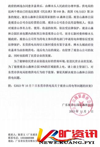 之后观音山公园收到了10月7日下发的广东电网有限责任公司东莞供电局的《关于陈景玉反映观音山用电等问题的回复》做了如下答复:一是关于“观音山公司依法申请电力增容和正常供电,东莞供电局和供电公同为何迟迟不落实”的调查情况。我局与观音山公司签订的《供用电合同》已约定产权分界点,并已按约定供电至观音山公园用电地城范围,至今一直正常用电.观音山公园对红线区域内的用电规划需求。应由观音山公园自行规划建设,可委托有资质的施工单位开展。观音山公园自2018年以来,分别向我局咨询观音山公园增容、观音寺新装等业务。一是在2018年6月,第三方施工单位自称受观音山公园委托向我局属地供电服务中心咨询在用电户名为“东莞市樟术头镇人民政府”的315 千伏安变压器的基础上,增容一台1000干伏安变压器,但经办人无法提供原用电户身份证明材料、委托书等相关资料;二是在2021年3月,观音山公园的“东莞市樟木头观音寺”向我局属地供电服务中心提出1200千伏安容量的用电申请,但观音寺先后提供的报装资料中登记的用地面积不一致,红线图与现场不符,经咨询市政府相关部门确认观音寺所在地块及建筑存在“未办理林地使用手续”、“未办理建设用地规划许可证和建设工程规划许可证”的情况,根据《国务院办公厅关于严格执行有关农村集体建设用地法律和政策的通知》(国办爱[2007]71号)、《广东會人民政府关于建立土地管理共同责任制度 的通知》(專府(2008] 100号)要求,“对未取得合法用地手续的建设项目,电力企业不得通电”。