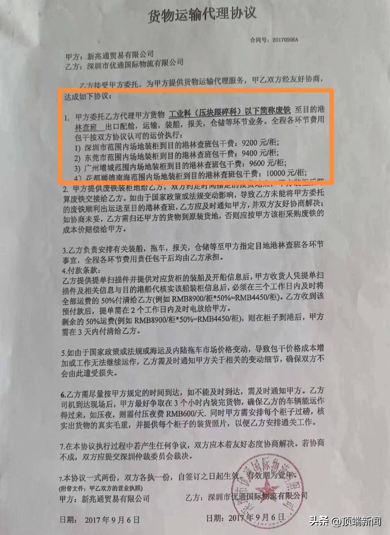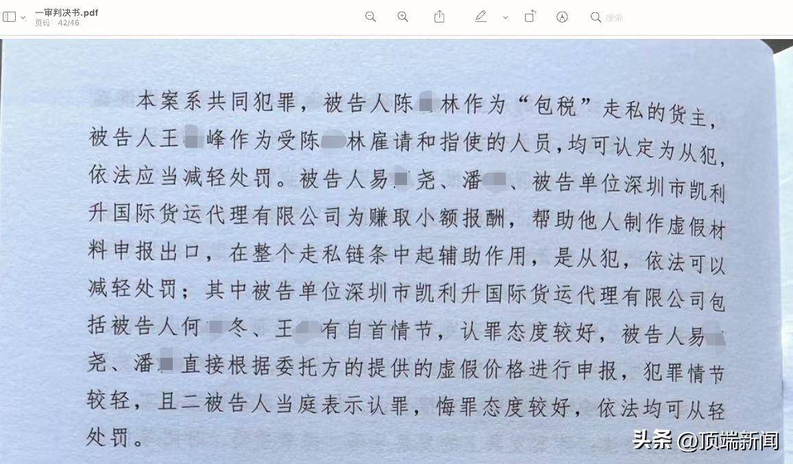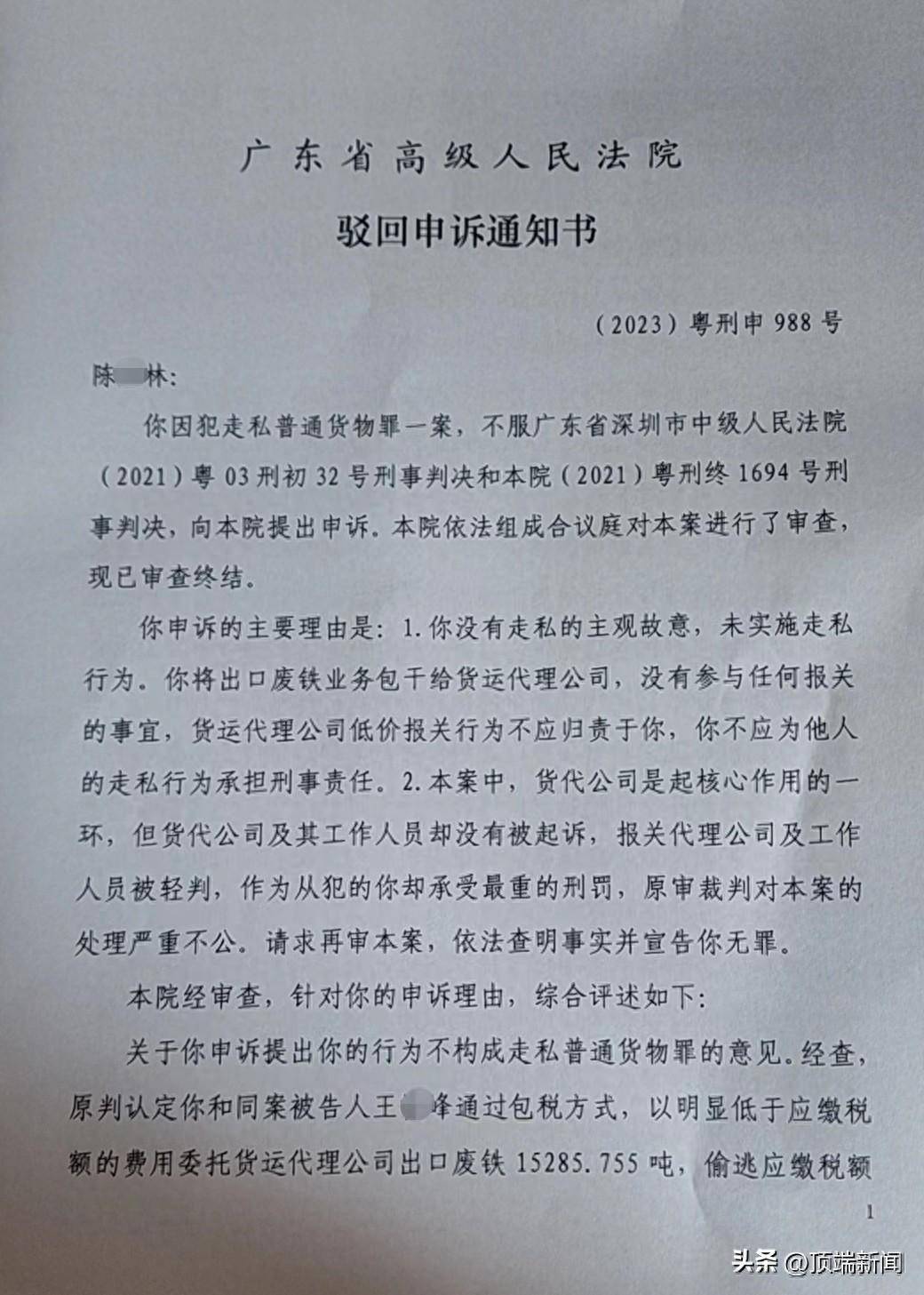 原标题:“只有从犯”的废铁走私案:获刑者追问“主犯去哪儿了” 顶端新闻记者 高鑫 先后4次审判,陈某林的刑期从11年变为8年、后又降至6年。尽管还有8个月就将刑满释放,陈某林及家人始终坚持申诉。 这是一起离奇的普通货物走私案。生效判决中,法院认定的团伙犯罪,只有从犯、没有主犯。部分“另案处理”者,获得检方不予起诉处理。 陈某林申诉称,本该作为主犯的货代公司及其工作人员,在检察机关审查起诉环节被“剥离”,致使他沦为“替罪羊”,以从犯身份承受了最重刑罚。 2023年11月22日,广东省高级人民法院书面回复,称决定受理其申诉,并对是否符合再审立案进行审查。一个月后,法院驳回了陈某林的申诉。 废铁“包干”出口泰国 1972年出生的陈某林是香港人。1993年,他回到大陆,在深圳田贝路开了家化工建材店。经营至2000年,陈某林转去东莞做铝材生意。2007年之后,他重回深圳投资房产、股票等。 王某峰是湖北人,南下打工。2005年至2010年,他在东莞市一家五金公司做管理部经理。其间,陈、王二人相识。 陈某林家属讲述,有亲戚在泰国开钢铁厂。当地原料不足、价格较贵,亲戚便委托陈某林在国内收购废铁,再出口运往泰国。 “有一二十个工人,每天要到几百里外找货源。”陈某林家属说,亲戚会出每吨50元作为开销,如工人工钱、饭费、油费等。 一个人忙不过来,陈某林找到旧识王某峰做帮手。据法院判决摘录的供述,陈某林证实,他负责国内采购废铁以及支付出口的包柜费用,王某峰负责联系货代公司。 他们找到东莞港骏鹏物流有限公司(另案处理,下称“骏鹏公司”)、上海环世捷运物流有限公司广州分公司(另案处理,下称“环世广州公司”)、深圳优通国际物流有限公司(另案处理,下称“深圳优通公司”)三家货代公司,“包干”出口废铁至泰国。 骏鹏公司外贸部业务经理郭某权(另案处理)案发后供述,2017年7月,王某峰直接找到其公司,要包税出口废铁到泰国林查班港。他联系了有合作的报关负责人易某尧。易告诉他,废铁出口报关费用包含税费大约每个柜八九千元。 郭某权给出报价,海运费和拖车费大约3300元/柜,报关费算8700元/柜,包含税费代理出口总费用12000元/柜。郭某权与王某峰协商后,定为10600元/柜。 此后,他们组建了“废铁工作组”的微信群,正式运作废铁出口。王某峰把过磅单等材料发在群里,骏鹏公司负责跟单的人将材料转给易某尧。 易某尧以其他公司名义,根据骏鹏公司提供的装箱单信息、过磅单信息制作报关所需的虚假单证,以及代理报检费、代理商检费用、消毒费用等。报关后,骏鹏公司按7500元/柜包含税费的报关费结算。 报关价格不断降低 环世广州公司的操作模式,与骏鹏公司的十分类似,但最终报关价格降低了。 2017年8月初,陈某林、王某峰与环世广州公司销售专员王某(另案处理)商谈“包干”代理出口废铁业务。 王某向其公司主管吴某恒(另案处理)汇报后,陈某林、王某峰二人便以香港新兆通公司名义,委托环世广州公司以10000至11100元/柜的价格“包干”出口废铁。 环世广州公司以7000余元/柜的价格,将上述废铁报关业务包税“包干”给深圳市凯利升国际货运代理有限公司(下称“凯利升公司”)。后者安排员工制作虚假合同、发票等相关废铁报关单证。 此后,环世广州公司将凯利升公司的包税报关价格又压低至5200元/柜。凯利升公司亦将废铁申报价格从800元/吨降至约492元/吨。 深圳优通公司的操作模式跟上述两家略有不同。王某峰找到深圳优通公司后,“包干”费用已变为8900元至9200元/柜。深圳优通公司老板黄某运(另案处理)根据其所能赚取的利润,计算出废铁的申报价格约为294元/吨。 黄某运联系了在贸易公司做业务员的潘某,让潘某以上述价格为其报关出口废铁,答应每票报关单支付潘某600元。潘某虽知该申报价格过低,仍以该价格制作了虚假合同、发票等报关单证,交给另一货代公司向蛇口海关申报。 2017年9月,深圳优通公司负责“包干”出口的85个货柜因低报价格被蛇口海关查扣。该公司出面解释,求海关放行,未奏效。 随后,这起废铁出口生意,因偷逃税款被认定为走私案。据悉,由于国内废钢资源紧张,国家对废钢出口一直保持着40%的高税率,且不享受出口退税政策。 2018年6月,陈某林、易某尧、郭某权、王某、潘某、黄某运等人相继被抓。王某峰被网上追逃后,泰国执法部门将其控制并移交我国。 被控走私逃税661万 司法资料显示,这起走私普通货物案,由衡阳海关缉私分局查办,后移交深圳市检察院审查起诉。 2020年3月,深圳市中院对此案作出一审判决。陈某林、王某峰不服,提出上诉。同年11月,广东省高院二审裁定:撤销原判,发回重审。 重审一审时,检方起诉书指控,2017年8月至9月,为逃避海关监管,获得非法利益,陈某林伙同王某峰从东莞、深圳等地废品收购站,以每吨1300元至1500元左右的价格采购废铁,在明知出口废铁需征收关税的情况下,以新兆通公司名义,通过遮涂废铁真实采购价格的方式,以8000余元至11000余元/柜(每柜约26至27吨)不等的价格,分别委托骏鹏公司、环世广州公司、深圳优通公司“包干”出口至泰国林查班港。 上述三家货代公司在不提供真实货主信息、采购合同、发票等相关资料的情况下,又分别委托易某尧、凯利升公司、潘某报关出口废铁。后三者制作了虚假合同、发票