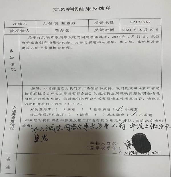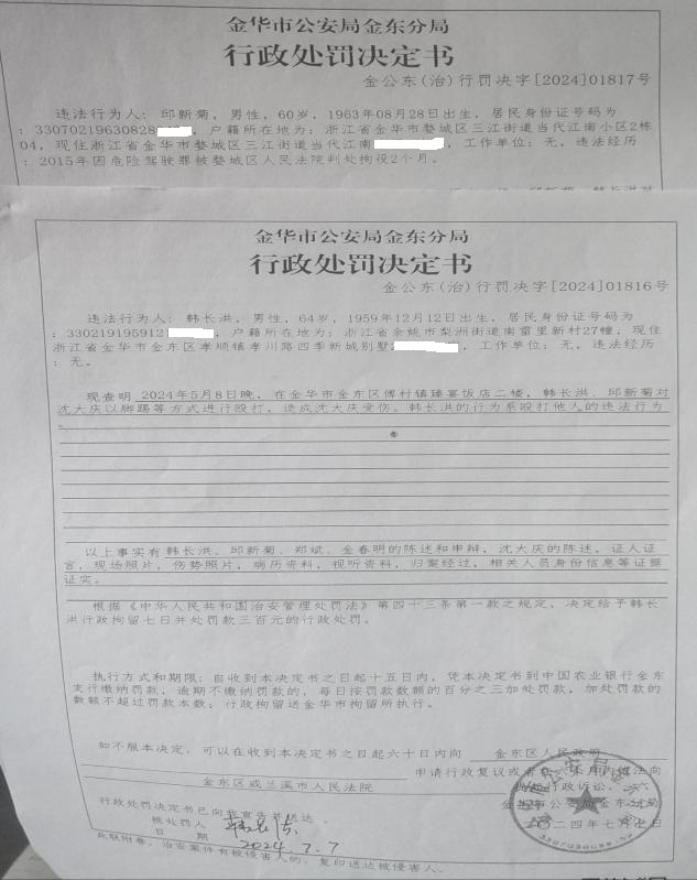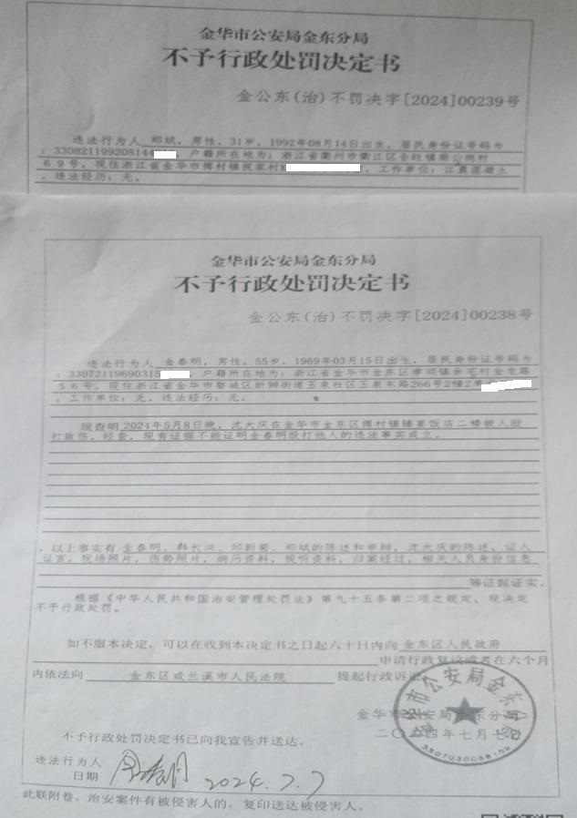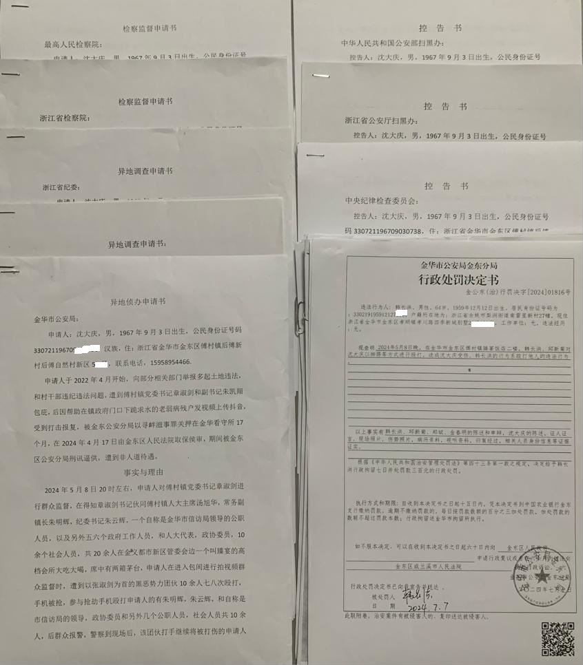 拍摄镇领导在会所大吃大喝竟被群殴,书记仅被警告调离 多次举报反映村干部问题 拍摄村民下跪求水被拘 沈大庆家住金华市金东区傅村镇,原来经营一家装修公司,因多次举报村干部多种违法违规行为,镇政府都没有给予答复,为此他在抖音上多次发视频举报。 沈大庆多次向傅村镇政府及章淑剑书记举报后傅新村村支书侵占村里公共财产,但一直没得到回复。2022年,沈大庆向浙江省纪委举报章淑剑在担任傅村镇镇长、党委书记期间,直接参与破坏耕地、非法为他人谋取巨额利益、无视群众举报,不作为、乱作为、充当违法犯罪人员“保护伞”等问题。当年6月8、9日,章淑剑亲自带队率领几十名镇政府工作人员,在没有了解实质遗留问题的情况下强制搬离了沈大庆的合法财物,但对同村类似沈大庆同样的情况却不闻不问…… 2022年11月3日,沈大庆拍摄了深塘坞村残疾人吕肖琴和父母在镇政府门前举牌求供水的视频,连同之前吕肖琴8旬母亲提水视频,经编辑后一起发到抖音上。此举为他招来了牢狱之灾,2022年11月18 日,金东区公安机关以其涉嫌寻衅滋事罪为由将其刑事拘留,后被检察机关批准逮捕,直到2024年4月17日才被金东区人民法院取保候审,拒不认罪的他已被关押17个月。 此案经三次退侦、三次庭审后,检察院终于撤诉,作出了不起诉决定。详见《发布在镇政府门口下跪视频案 三次庭审后检察院撤案》。 获悉镇委书记聚众大吃大喝 拍摄中被群殴手机被抢 当地知情人王先生告诉笔者,章书记特别贪杯,至少能喝白酒两斤半,还经常向服务对象讨酒喝。今年5月8日, 在外面吃饭的沈大庆接到了一个电话,说有傅村镇十几个公务员与几个企业老板在一个叫“臻宴会所”的地方聚餐,光茅台酒就摆了两箱! 沈大庆开始时不信,后来与一个蒋姓朋友开车到会所查看,并吩咐朋友在车里等。 蒋先生等了很久,一直没看见沈大庆下楼,也没有给其打电话,不久又看见傅村镇纪委书记朱云辉出来了,蒋先生叫了他一声,朱云辉转过头看到蒋先生,不但没回应反而扭头就跑。蒋先生据此确认朱云辉是在跟书记章淑剑等人在里面吃饭。蒋就给沈大庆打电话,听到沈大庆在电话里喊:“你快点来,我被他们要打死了!”蒋先生感觉出了大事,当即拨打110报警了。 防暴大队、巡特警大队陆续派人到场。 然而110的警察过了十几分钟后才到现场,出警警察两次上楼找沈大庆下楼后告诉蒋先生没找到沈大庆。并表示要撤警时,蒋先生向出警的派出所副所长表示:我是亲眼看见他上去的,这里没有后门,他要出来必须要经过我这,如果找不到沈大庆,万一出了什么问题,我肯定会盯着你不放! 副所长只好重新带人上楼搜查。第三次上楼才把沈大庆找出来。 沈大庆被打后抬出来时的视频截图,蒋先生询问时已经神志不清了 等蒋先生再次看到沈大庆时,他已经是被抬下来的,被打的面目全非,浑身是血。蒋先生第一时间拍下了沈大庆受伤的照片。 沈大庆被打的死去活来,忍受不了,欲从该窗户跳出。 几个月后沈大庆向笔者回忆当时的情形时依然心有余悸。他上楼后见一间房门虚掩着,推门一看,傅村镇委书记章淑剑、镇人大主席汤旭华、纪委书记朱云辉、副镇长朱明辉带领另外六、七个政府工作人员,市人大代表、华丰电动工具董事长幸永良、市政协委员韩长洪,金春明、郑斌、邱新菊等私企老版,以及10余名社会人员一起围着一张特别大的圆桌在吃喝,其中还有被沈大庆举报破坏土地的违法人员。于是,沈就拿出手机拍视频,但很快就被里面的人发现了。沈大庆问章淑剑:“章书记,我向你举报的事你不办?你在这里大吃大喝,还喝酒啊?!”纪委书记朱云辉大吼一声“:沈大庆你干嘛?!”一边和副镇长朱明辉冲到沈大庆面前,两人直接对沈大庆就是一个锁喉,一边对其进行殴打一边抢他的手机,沈大庆紧紧抓着手机往裤子口袋里装。 韩长洪冲过来照着沈大庆的肚子上踹了一脚,沈大庆当场翻倒,头撞在地上茅台酒的箱子上,韩长洪一边踹一边大声叫嚷:“打死他!往死里打!打死了我负责!” 屋里吃饭的十几人一拥而上,一边对沈大庆拳打脚踢,一边抢其手机。沈大庆紧紧抱着手机不敢松手。有个自称是市信访局领导的人上前拎着沈大庆的耳朵质问:“你到底有什么要求?!”对沈大庆进行拳打脚踢并扇耳光,其他人也不甘示弱,围上来又打,终于将沈大庆的手机抢走,并将沈大庆刚拍摄的视频删除。后来又把沈大庆拖到走廊和其他包厢殴打,打完后派专人看守,趁看守人不注意时,沈大庆挣扎着爬起来,想从窗户上跳下逃走。但往外跳时被一个人抱住从窗户拖了下来,接着又有人过来打他,沈大庆就大喊救命!当时他看到一层有一个厨房,马路对面一个酒吧里也有很多人走出来,他一直喊救命,但始终没有人敢管。被拖回去的沈大庆又挨了一顿毒打后,手机才被还回来。此时恰好朋友蒋先生打电话过来,沈大庆急忙向其发出求救信号后,赶紧打110报警。110问在哪?结果还没等他说清楚位置,手机又被那帮人抢走了。沈大庆后面就昏迷过去了。 120急救车赶到以后,把沈大庆送到金华市中心医院救治。 当晚22:23的就诊病历显示沈大庆全身多处损伤,当晚23:30的病历显示体格检查为神志欠清,双侧瞳孔等大等圆,对光反应可,下颌、胸腹、左大腿、双足现多处挫伤、瘀紫,颈软;处理方式为:急诊留观、卧床休息;消肿镇痛对症治疗,不适随诊。 