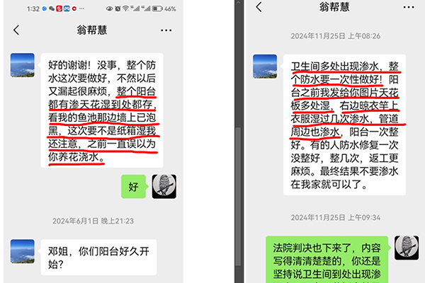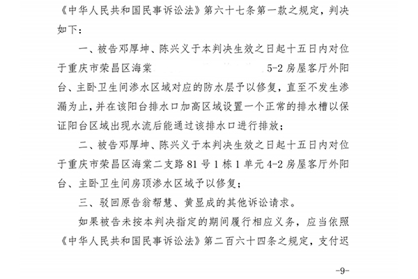“哪个擦过的?”翁帮慧还称:“我已经跟你说了,上面有水才能擦,没有水你擦有啥用?如果水都渗到那个位置了,你,你们下回都不要来了。” 10月9日,4-2翁帮慧又说她阳台、卫生间渗水。5-2邓厚坤等人去4-2阳台,没有看见渗水的情况,即要求察看卫生间。翁帮慧的丈夫黄显成称:“哪里有渗?没都没有,看不到,卫生间看不到了。” 翁帮慧打断黄显成的话,称:“你不要再说!他在乱录像!” 翁帮慧还称:“在你们来之前,物业人员和网格员也来看了,都说在渗水。” 物业卢某某证实:“我和网格员刚刚去看了,还拍了照片,没有感觉到有湿的。” 虽不存在明显漏水、但存在渗水情况! 修复5-2渗水区域防水层(设置排水槽)、4-2房顶渗水区域 法院认为:4-2房屋客厅外阳台、主卧卫生间虽然不存在明显漏水,但存在渗水情况,并已造成房屋对应区域漆面和抹灰面受损,影响到4-2相应区域的正常使用,5-2业主作为管理人、使用人,已构成侵权,应承担相应的民事责任。4-2业主要求5-2业主对5-2客厅外阳台、主卧卫生间渗水区域对应的防水层予以修复直至不发生渗漏为止,并将4-2客厅外阳台、主卧卫生间因渗水导致受损的区域予以修复,符合法律规定,予以支持;对4-2主张的赔偿经济损失5000元的请求不予支持。 对4-2业主要求5-2业主对5-2阳台做檐口、外挡水的诉讼请求,法院认为房屋本身无檐口、外挡水,也未举证证明5-2业主有改变阳台整体的平面状况,应承担举证不能的法律后果。 同时,因5-2业主在阳台排水口区域加高了3厘米左右以方便防止洗衣机,该行为将改变阳台平面的排水状态,并可能改变该区域出现水流后的排水状态(即可能出现水流直接外溢),应予以整改,结合日常生活经验及4-2业主意见,法院对4-2业主的该诉讼请求支持为在排水口加高区域设置一个正常的排水槽,以保证阳台区域出现水流后能通过该排水口进行排放。 判决:一是5-2邓厚坤、陈兴义于判决生效之日起十五日内对5-2阳台和卫生间渗水区域对应的防水层予以修复直至不渗漏为止,并在阳台排水区域设置一个正常的排水槽;二是以保证阳台区域出现水流后能通过该排水口进行排放,对4-2客厅外阳台、主卧卫生间因渗水导致受损的区域予以修复;三是驳回4-2翁帮慧、黄显成的其他诉讼请求。 ▲法院判决书,截图。邓厚坤 提供 11月14日,荣昌法院作出(2024)渝0153民初5372号民事判决。 庭审前,阳台到处漏水,衣物晾到客厅、客卫 执行阶段,还没有做防水层,又把衣物晾到阳台? 4-2翁帮慧为了证明自己阳台漏水严重,通过微信发很多照片给5-2邓厚坤或陈兴义。 第一组照片:第一张拍摄于2024年5月19日晚,搁在排水管下方一个纸箱中间湿透一团;第二张拍摄于5月27日晚,阳台顶上长405厘米、宽32厘米(另:排水管处长200厘米、宽45厘米)木制天花板被水湿透。 ▲阳台漏水。邓厚坤 供图 第二组照片:先后拍摄于2024年5月26日、9月24日开庭审理之前,4-2翁帮慧称:“阳台到处漏水,只能把衣物晾到客厅、客卫。” ▲庭审前,阳台漏水,衣物晾在客厅、客卫。邓厚坤 供图 第三组照片:拍摄于2025年4月9日,案件进入执行阶段,4-2翁帮慧又把衣物又晾到阳台。 ▲执行期间,防水层还没做,衣物晾到阳台。邓厚坤 供图 5-2邓厚坤称:“我就想不明白,开庭前就说到处漏水,才把所有衣物晾到客厅外阳台,为什么进入执行阶段,防水层还没有做,就不怕漏水?又把所有衣物又晾到阳台?” 社区副书记一个电话 执行法官改变执行方案,不管漏不漏水,5-2案涉房必须做防水层! 5-2邓厚坤收到判决书后,多次主动联系4-2翁帮慧安排时间对渗水相应区域漆面和抹灰面受损、剥落处进行修复。翁帮慧称:“卫生间多处出现渗水,整个防水要一次性做好,阳台之前我发给你的图片天花板多处湿的,右边晾衣杆上衣服湿过好几次,管道周边也渗水,阳台一次性做好!” ▲翁帮慧与邓厚坤聊天记录。邓厚坤 供图 “阳台排水槽已经做好。”2025年3月22日,5-2业主在阳台安装了一个监控,把卫生间和阳台渗水区域围起来24小时关水检测,26日执行法官朱红兵过来也没看见漏水情况,称:“我和钟法官讨论了一下,洗衣机只要挪走了,不漏水了,就没必要敲地板砖做防水了。”