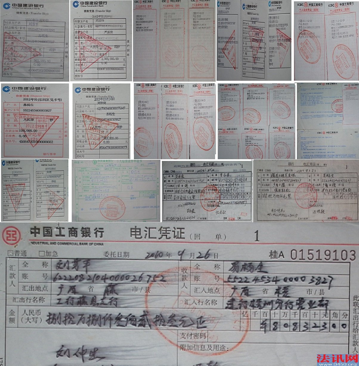 广西藤县靠河沙起家的行贿累犯放高利贷,还款后仍起诉获胜致公司维艰 独立撰稿人 李海波 易杨生,原为广西梧州市农行职员,因经济问题被开除公职。其妻子区某为梧州市审计局干部。据悉此人极不简单:靠河沙生意起家,放高利贷获利颇丰,对方还钱后竟然起诉获胜而取得一楼盘三分之二的商铺;他们有了一个女儿,但为了要儿子,易杨生与她人生了个儿子通过其他手段顺利上户。 多次行贿:受贿官员获刑,行贿屡犯易杨生却逍遥法外 据中国法院网消息:陆志光于2009年至2014年期间任梧州市公安局副局长,先后分管经济侦查支队、局对外联络办公室、交警支队等工作,其在任职期间,利用职务便利,在案件办理、合作经营等方面为他人谋取利益,非法收受赵学伟、黄位灿、徐鹏、易杨生、黎茂强给予的财物共计人民币230万元。2017年5月,陆志光被判刑8年。 易杨生行贿了多少财物?判决书无法查询。给易杨生手机短信核实,一直没有答复。撰稿人便通过桂林中院官网公布的民意沟通信箱glzy_mygt@chinacourt.org,请求告知易杨生送了多少财物。发送二次均显示邮箱不存在,便发给官网邮箱glfyw2010@163.com请求转发给该院领导。截至发稿,未见任何回应。 2015年1月新浪广西消息:1999年至2013年3月间,被告人蔡聪先后利用担任梧州市房改办开发科科长、梧州市市政管理局副局长、梧州市城市建设投资开发有限公司总经理、梧州市藤县副县长、藤县规划评审委员会委员职务之便利,为吕德培、吕亦灿、潘雄尧、黄国朝、区太庄、莫水生、易杨生、陈朝新实施房地产开发项目谋取利益,收受上述人员送给的钱物共计人民币268.32825万元。 这次行贿易杨生送了多少?据广西法治日报2015年11月报道,2010年年底的一次饭局中,时任藤县副县长蔡聪“收获”易某的20万元现金和2瓶名酒、1盒好茶。2015年11月终审判决蔡聪因受贿268万多元,判刑15年。 这是公开报道的两起行贿受贿案件,受贿官员均被判刑,而行贿者易杨生却毫发未损,是何缘故?广西当地政法机关为什么如此袒护行贿惯犯,估计是易杨生的关系太复杂吧?!大家也相信易杨生绝对不止是这两起行贿吧,只是受贿者供述了而已! 放高利贷:对方还款依然起诉获胜,获利不菲 藤县米兰房地产开发有限公司(以下简称米兰公司)在开发房地产项目“国贸大厦.国贸中心”时,因为资金困难于2010年8月5日向易杨生借款500万元,当天,米兰公司给付易杨生15万元利息,易杨生写了载有“今收到刘芳平借款2010年8月份利息人民币壹拾伍万元整,此据,收款人易杨生”内容的收条。 8月30日,再次借500万元给刘居伟等5人,刘芳平为保证人,双方没有约定利息,只是约定借期6个月,到期不归还按5%支付违约金。此“借款协议书”载明米兰公司承担连带责任,但没有米兰公司的印章。 9月5日,因易杨生觉得米兰公司股东之间问题多欠保障,便要求改为刘居伟家族私人借款,米兰公司为担保方,由此将8月5日的借款协议书原件交还给公司。 9月10日,借给刘居伟等人300万元,刘芳平作为还款担保人及代收款人出具了收条给易杨生,载有“该叁佰万元借款利息按月息5%计算(按实际天数计算),于每月10日前存到易杨生指定的账户”等内容。 9月26日,易杨生借给刘居伟等人400万元,刘芳平同样 以“借款担保人及代收款人”出具了收条给易杨生,载有“该肆佰万元借款利息按月息5%计算(按实际天数计算),于每月10日前存到易杨生指定的账户”等内容。 至此,易杨生借给刘居伟家族总计是1700万元。 但从2010年8月5日起,刘居伟等人一直在还款。从其财务提供的《刘居伟等人及其指定代还款人代为偿还易杨生款项的明细表》可以看出,在8月30日即再次借款500万元的当天,刘芳平从建行汇给易杨生建行尾号3827账户36.3万元;9月5日刘芳平所属的藤县三姐美食城从信用社转易杨生建行同账户9.5万元;9月10日刘芳平从建行汇给易杨生建行账户10.5万元;9月26日,刘芳平工行账户汇给易杨生建行同账号80.8323万元。也就是说在2010年借款500万元一个月,刘芳平就还了159.1323万元。另外在2012年1月至2013年3月刘仲剑按照易杨生授意在佛山市顺德区怡孚汽车销售公司分6次支付了141.2883万元的购车款【法院认定的事实是:2012年1月7日,刘某乙向广东省佛山市顺德区怡孚汽车销售服务有限公司订购奔驰ML63AMG型汽车一辆,当日现金支付定金1万元。之后的同年3月23日现金支付4万元;9月12日转账方式支付15万元;10月19日转账方式支付619883元。2012年10月19日,被申请人易杨生与怡孚汽车销售服务有限公司签订《销售合同》,约定易杨生购买奔驰ML63AMG型汽车一辆,车价1998000元。并由刘某乙出具《代付款证明》,确定其之前已付款819883元变为支付易杨生的购车款,易杨生亦在该证明上签名。】。2012年1月18日刘居伟按照易杨生要求,通过建行汇给易杨生姐夫严新贵300万元作为还帐;在5月18日,刘芳平现金存入易杨生建行尾号3827帐户12万元。之后从11月21日起至2014年4月18日,除了刘小燕、莫秋霞各自按照易杨生的要求转给朋友覃伟军50万元和270万元;其余28笔还款基本上都是通过刘芳平等人现金汇入易杨生尾号739 的工商银行或者3827建行账户中。至此,刘居伟等人累计还给易杨生的款项已达2247.4206万元。以上资金往来,莫秋霞、刘小燕等分别作了声明与易杨生无经济往来,是代为还款。 另外在2014年1月3日,刘芳平同意易杨生在欠款中