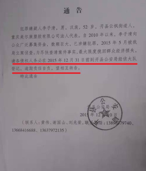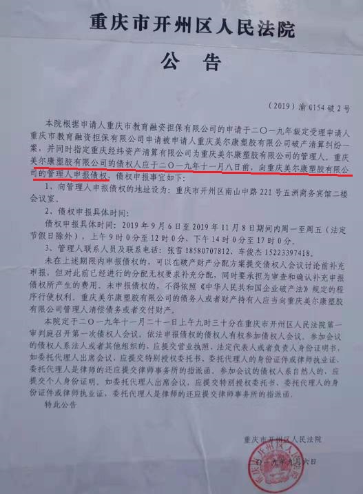 2019年7月17日,开州区法院裁定,受理申请人对美尔康公司的破产清算申请。而提请执转破的教育融资担保公司也是之前申报过的债权人,法院为何要单独受理该债权人的民事诉讼?难道250多名3000受害人都另行进行民事起诉来讨回自己的钱么?!如此一来,之前刑事判决的返还受害人财产岂不是一纸废话?!  2019年9月6日,开州区法院发布公告,要求债权人进行债权登记。 这样做,那前几年公安局、检察院、法院确认的债权人岂不是无效,他们做了无用功?!岂不是推翻了重庆市开州区人民法院(2017)渝0154刑初436号判决书?! 李子清及美尔康公司众多债权人表示对此非常失望,并将对此抗争不止。撰稿人将进一步关注此事件!