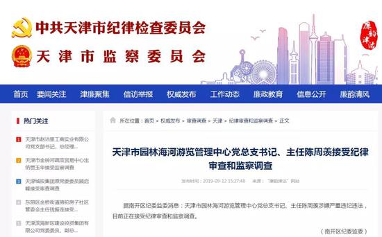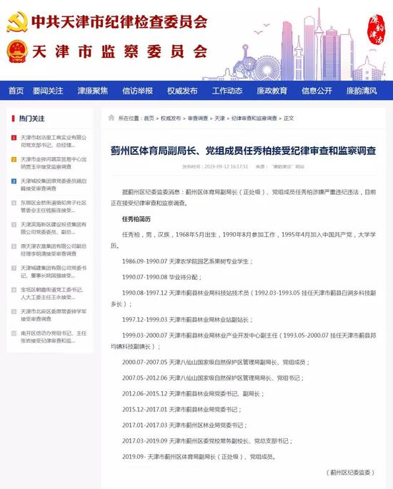 据蓟州区纪委监委消息:蓟州区洇溜镇党委委员、纪委书记、监察组组长陈亮涉嫌严重违纪违法,目前正在接受纪律审查和监察调查。 ![]() 廉韵津沽网站截图 陈亮简历 陈亮,男,汉族,1980年11月出生,2001年6月参加工作,2004年6月加入中国共产党,大学学历。 1996.09-1999.07 天津市财经学校会计电算化专业学生; 1999.07-2001.06 待业; 2001.06-2009.07 天津八仙山国家级自然保护区管理局财务科科员(2002.09-2004.07 在天津市委党校经济管理专业专科班学习; 2005.08-2007.12 在中央党校函授学院经济管理专业本科班学习); 2009.07-2014.12 天津八仙山国家级自然保护区管理局旅游管理中心副经理; 2014.12-2018.04 天津八仙山国家级自然保护区管理局财务科科长; 2018.04-2018.08 天津八仙山国家级自然保护区管理局办公室主任; 2018.08-2018.10 天津市蓟州区洇溜镇党委委员、纪委书记; 2018.10- 天津市蓟州区洇溜镇党委委员、纪委书记、监察组组长。 据蓟州区纪委监委消息:蓟州区体育局副局长(正处级)、党组成员任秀柏涉嫌严重违纪违法,目前正在接受纪律审查和监察调查。 ![]() 廉韵津沽网站截图 任秀柏简历 任秀柏,男,汉族,1968年5月出生,1990年8月参加工作,1995年4月加入中国共产党,大学学历。 1986.09-1990.07 天津农学院园艺系果树专业学生; 1990.07-1990.08 毕业待分配; 1990.08-1997.12 天津市蓟县林业局科技站技术员(1992.03-1993.05 挂任天津市蓟县白涧乡科技副乡长); 1997.12-1999.03 天津市蓟县林业局林业站副站长; 1999.03-2000.07 天津市蓟县林业局林业产业开发中心副主任(1993.05-2000.07 挂任天津市蓟县邦均镇科技副镇长); 2000.07-2007.05 天津八仙山国家级自然保护区管理局副局长、党组成员; 2007.05-2012.06 天津八仙山国家级自然保护区管理局局长、党组书记; 2012.06-2015.12 天津市蓟县林业局党委书记、副局长; 2015.12-2017.01 天津市蓟县林业局党委书记; 2017.01-2017.03 天津市蓟州区林业局党委书记; 2017.03-2019.09 天津市蓟州区委党校常务副校长、党总支部书记; 2019.09- 天津市蓟州区体育局副局长(正处级)、党组成员。 据南开区纪委监委消息:天津市园林海河游览管理中心党总支书记、主任陈周羡涉嫌严重违纪违法,目前正在接受纪律审查和监察调查。 ![]() 廉韵津沽网站截图 来源:廉韵津沽 |