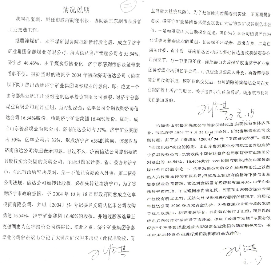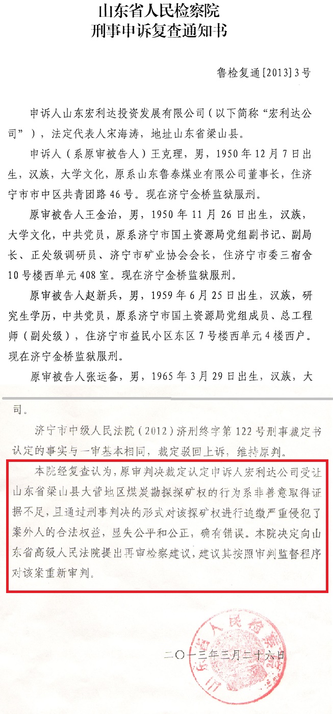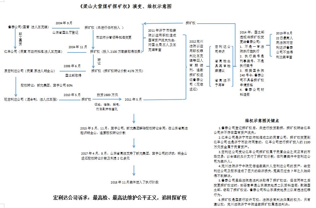 济宁市原市长梅永红,2011年任职期间,在腐败分子张延金(受贿,判刑15年)、曹旭东(受贿,判刑12年)的诬告纵容下,竟然目无党纪国法,将权力凌驾于法律之上,行政干预司法,迫使济宁市中级人民法院对民营企业山东宏利达投资发展有限公司横加迫害,致使宏利达公司经营停止、一企业主胡全山债台高筑2亿多元、两家民营企业濒临破产。 当今,从中央到省委都对民营企业的发展高度关注,宏利达公司及胡全山虽多方奔走呼号,时至今日,冤案仍未得到解决。梅永红的这一行为严重侵害了民营企业的合法权益,严重破坏了济宁市的营商环境,使很多外商对济宁市的投资环境望而却步。 案件背景及过程 民营企业依法取得探矿权 山东宏利达投资发展有限公司(以下简称:宏利达公司)为了受让《梁山大营煤矿探矿权》,于2008年6月设立立,民营企业,注册资本金4000万元,股东扈长全(曾用名:胡全山)占股95%、杨长勇占股5%,扈长全任法定代表人。 宏利达公司成立之后,依法以合理对价受让了济宁亿丰投资有限公司(以下简称;亿丰公司)的《梁山大营煤矿探矿权》(以下简称:大营探矿权),证号;T01120080901015698,支付了探矿权转让价款4178万元。  2010年5月,宏利达公司为了建设梁山大营煤矿,与新光集团有限公司(以下简称:新光集团)、淮北蓝宇洗精煤有限公司(以下简称:蓝宇公司)达成了合作协议,扈长全、杨长勇分别将75%、5%的股权转让给了新光集团、蓝宇公司,新光集团总经理宋海涛任法定代表人、董事长,扈长全及蓝宇公司法定代表人任宇等任董事。宏利达公司入驻矿区驻地,并于2010年6月、2011年3月先后增资3000万元、6000万元,注册资本金达到1.3亿元,开始征地、修路、架电、打井、打主副井检查孔,投资将近2800万元,采矿权申请同时也在进行中,山东省发改委已准备批准大营煤矿采矿权。 恶人告状,梅永红干预司法制造冤案 2011年6月,鲁泰煤业公司原总经理张延金、济宁市国资委原主任曹旭东到济宁市原市长梅永红那里告状,称大营探矿权原为鲁泰公司所有,系国有资产,两个多亿,大营探矿权变更为国有资产流失,梅永红被蒙蔽,不做调查研究,武断干预司法,指使济宁市检察院将济宁市国土资源局原副局长王金治、规划科科长张运备、总工程师赵新兵、鲁泰煤业公司原董事长王克理以滥用职权罪刑事拘留、并批准逮捕,将大营探矿权冻结。 案件背景:2004年9月14日,山东省国土资源厅根据鲁泰公司提出的申请,向该公司无偿颁发了“山东省梁山县大营地区煤炭普查”勘查许可证,探矿权证号:3700000410999,并载明勘查面积43.32平方公里。鲁泰公司取得探矿权后,并没有任何资金投入,也没形成资产 ,它仍然只是国家的行政许可。 鲁泰煤业公司是国家批准的债转股企业,其中:中国信达资产管理公司占54%,济宁矿业集团占46%。为加强产权制度改革,推进鲁泰公司股份制改造,股东双方研究后,济宁市政府于2004年8月26日召开会议,并下发了济政纪字[2004]54号《专题会议纪要》决定:由鲁泰公司干部职工出资成立济宁亿丰投资公司,分别接收信达公司和济矿集团分别退出16.54%、 16.46%的国有股权,退出后的股权比例调整为:信达公司占37%、济矿集团占30%、亿丰公司占33%,根据《专题会议纪要》精神, 鲁泰煤业有限公司干部职工共集资3350万元,以捆绑式的方式由28个自然人作为股东代表进入股东会,2004年10月济宁亿丰投资公司日正式设立,选举股东鲁泰公司董事长王克理同时兼任亿丰公司董事长,张延金未入股亿丰公司。后因鲁泰公司的股份制改造未能到位,与亿丰公司的关联关系随之终结。 2004年11月,为了更好的开发利用好济宁的煤炭资源,经分管工业的副市长魏玉栋、副秘书长孔宝琪同意,市国土资源局审查后报请省国土资源厅批准,将大营探矿权变由鲁泰公司更到亿丰公司名下,勘查证号370000421320,面积仍为43.32平方公里。因大营探矿权变更前鲁泰公司尚未投资勘探,所以大营探矿权变更仍然是行政许可和勘查权力的变更,并非资产变更,根本没有国有资产流失。 2004年12月,亿丰公司取得了大营煤矿探矿权后,即开始了煤炭勘查工作,与江苏煤炭地质勘察二队签订了“山东省梁山县大营井田勘察施工协议”,与江苏煤炭地质物测队先后五次签订“梁山县大营煤田勘探区”地震勘探工程施工合同, 在两年多的是时间里亿丰公司共投入勘探资金2100万元。 2006年6月,江苏煤炭地质勘察二队和江苏煤炭物测队形成了“山东省梁山煤田大营井田勘探报告”,2006年9月25日,山东省国土资源厅评审了“勘探报告”,出具了鲁资能备字【2006】33号《山东省梁山煤田大营井田勘探报告》矿产资源储量评审备案证明。自此大营煤炭探矿权才具有了商业价值。民营企业投资取得的成果,为私有财产,不属于国有资产。 2007年7月25日,亿丰公司增加了勘查面积,到国土资源部换发了新的矿产资源勘查许可证,证号0100000720556,勘查面积54.72平方公里。 2007年底,国家纪委、煤矿安全总局发布了煤炭企业领导干部不准投资入股煤矿问题的通知,根据通知精神,亿丰公司于2007年4月18日召开股东会议,会议通过了《关于王克理等五人退出公司股权的议案》,退出的股份由市国有承接;股权退出后,亿丰公司的股东由原28名调整为22名,市属国有资本成为该公司的第一大股东之后,亿丰公司纳入鲁泰公司整体管理,所拥有的煤炭资源作为鲁泰公司以后发