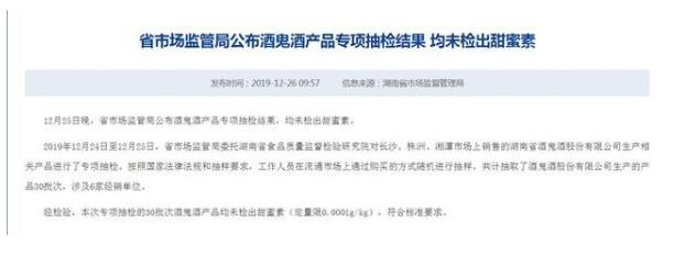 中新网客户端北京12月26日电 (谢艺观)近日,在春节前的白酒传统消费旺季,湖南酒企酒鬼酒陷入甜蜜素风波,与举报者打起了“口水仗”。双方各执一词,上演白酒行业年度“悬疑”大戏,到底谁在说谎? 图片来自酒鬼酒官网。 当事双方“口水战”不断升级 酒鬼酒供销有限责任公司“54°500ml老酒鬼酒”总代理北京来今雨轩文化传播公司(简称“来今雨轩公司”)法定代表人石磊日前实名举报称,来今雨轩公司代理的2012年“54°500ml老酒鬼酒”中被检出添加了白酒中禁止添加的甜蜜素。 石磊出示的3份国内有检测资质的机构对54°500ml老酒鬼酒的检测结果,均显示酒内含有“甜蜜素”。 随着事情不断发酵,12月21日晚间,酒鬼酒发布声明称,公司严禁添加甜蜜素,也从未采购过甜蜜素。 酒鬼酒解释,酒鬼酒原经销商石某(举报人石磊),因与公司发生经济纠纷,意欲谋求不正当利益,被公司严厉拒绝。湘西州中级人民法院、湖南省高级人民法院两审均驳回其高额赔偿的无理请求。现其不仅不积极履行法院判决,反而利用媒体炒作意图侵害上市公司利益,公司对他的行为深以为耻,并保留采取进一步措施的权利。 12月22日上午,石磊向媒体表示,“如果酒鬼酒继续否认这批产品有问题,他还会继续实名向省和国家市场监管总局举报。” 12月22日晚间,酒鬼酒再发公告称,石磊手中的54°500ml老酒鬼酒产品于2012年生产,为石磊独家定制产品,在出厂时符合国家食品安全相关标准和规定。已提请相关市场监管部门对本公司市场流通产品进行全面检测,并第一时间向社会公布检测结果。 12月23日上午,石磊发布声明称,“没有证据。酒鬼酒说出来的‘真相’,不是真相。孰是孰非,静候官方调查。” 抽检结果:未检出甜蜜素 12月25日晚,湖南省市场监管局公布酒鬼酒产品专项抽检结果,未检出甜蜜素。 通报称,对长沙、株洲、湘潭市场上销售的酒鬼酒生产相关产品进行了专项抽检。共计抽取了酒鬼酒生产的产品30批次,涉及6家经销单位,均未检出甜蜜素(定量限0.0001g/kg),符合标准要求。 湖南省市场监管局公布酒鬼酒产品抽检结果。 对此,石磊向中新网记者表示,“这是政府的行为,他们查的是市场流通的酒,跟我们举报的没有任何关系。我们举报的是仓库里的酒、流入市场的四万多瓶酒,以及酒鬼酒回收和退回去的两万多瓶的下落。 举报未被受理 举报者:将申请复议 记者获悉,12月26日,湘西州市场监督管理局向来今雨轩公司送达“投诉举报不予受理告知书”。 面对这一结果,石磊26日告诉中新网记者:不接受,会依法依规要求复议。 告知书显示,针对石磊公司递交的《关于实名举报酒鬼酒公司生产的酒鬼酒产品存在严重质量问题并欺骗消费者的材料》,经审查,该举报诉求已经湖南省高级人民法院终审判决,根据《食品药品投诉举报管理办法》相关规定,湘西州市场监管局经研究决定,不予受理。 双方纠纷已闹了近四年,曾对薄公堂 记者整理酒鬼酒的公开资料发现,2012年4月19日,来今雨轩公司与酒鬼酒签订了《买断产品总代理合同》,独家定制并销售54°500ml 老酒鬼酒产品。并以3000万元的价格先后购买了全部产品,共计125624瓶。 2014年4月至2015年3月,酒鬼酒陆续生产了8万瓶54°500ml老酒鬼酒(40吨酒水),作为市场政策支持,无偿赠送给石磊。 2016年初,酒鬼酒提出对经销商存有疑虑的2013年前所有库存产品予以退换,并在友好协商的基础上,给予合理补偿。石磊要求酒鬼酒将其库存的所有54°500ml老酒鬼酒产品共计125509瓶以238.8 元/瓶的结算价格进行回购,其中2012年批次由其购买的有51300瓶,2015年批次本公司无偿赠送的有74209瓶。 但,酒鬼酒未同意石磊对公司赠送产品及与公司产品无关的广告费用给予补偿的要求。 2017年4月,石磊以此向湖南省湘西土家族苗族自治州中级人民法院提起诉讼。2019年4月8日,法院做出判决:被告酒鬼酒供销有限责任公司收到原告来今雨轩公司退货(2012年生产的54°500ml老酒鬼酒)后3日内将货款退还给原告来今雨轩公司。 2019年4月,来今雨轩公司向湖南省高级人民法院提起上诉。2019年10月25日,湖南省高级人民法院做出终审判决:驳回上诉,维持原判。酒鬼酒称,截至日前,来今雨轩公司仍未按照生效判决退货。 延伸 ——甜蜜素是个啥?会危害健康吗? 甜蜜素,其化学名称为环己基氨基磺酸钠,是食品生产中常用的添加剂。甜蜜素摄入过量会对人体的肝脏和神经系统造成危害,对代谢排毒的能力较弱的老人、孕妇、小孩危害更明显。 《食品添加剂使用卫生标准》(GB 2760-2014)规定,甜蜜素在水果罐头、果冻、冷饮、复合调味料等食品中的最大使用量为0.65g/kg,这个含量标准也是配制酒的标准。但白酒并不在其中。 “白酒由于特殊的酿造工艺,以及甜蜜素本身的不可代谢性,实际上是有一定危害的,甜蜜素也是白酒明确禁止添加的。”白酒行业分析师蔡学飞指出。 事实上,白酒违规加甜蜜素事件,这些年屡见不鲜。 2017年,山西汾阳市杏花村镇晋裕白酒公司生产的500ml/瓶60%vol得造花香酒检出甜蜜素;2015年,黑龙江鹤岗市绥滨县二职白酒厂生产的“纯粮烧白酒”和“家有喜事白酒”被检出添加甜蜜素;2015年4月生产的四特酒,被查出甜蜜素不合格。 “甜蜜素对人体影响相对有限,很难通过日常饮食达到有害摄入量。”中国食品工业协会白酒分会秘书长马勇接受媒体采访时表示,白酒中禁止添加甜蜜素