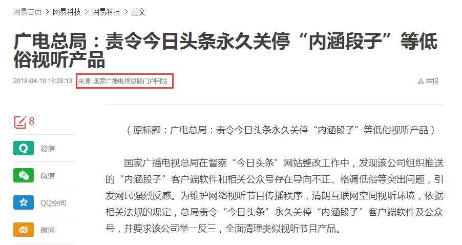 真的有点心凉了,永久关闭,不是整改!目前APP还能使用,具体消息是否准确要观察下。 “内涵不死,抖音终究是太子”难道抖音真的要登基一统短视频行业了? 地址:http://tech.163.com/18/0410/16/DF1V38D400097U7R.html 微博:https://weibo.com/2803301701/Gbs6C8ELc(人民日报) 中央:http://www.sapprft.gov.cn/sapprft/contents/6582/365922.shtml 2018年4月11日 10:44:48 补充几个视频 很多段友闹到广电门口去了 |