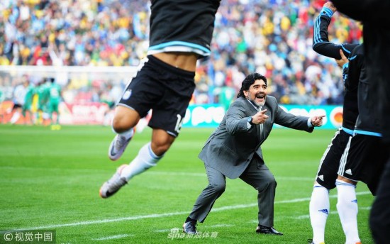 2010年6月12日,南非约翰内斯堡,2010世界杯B组小组赛,阿根廷Vs尼日利亚。马拉多纳庆祝胜利。