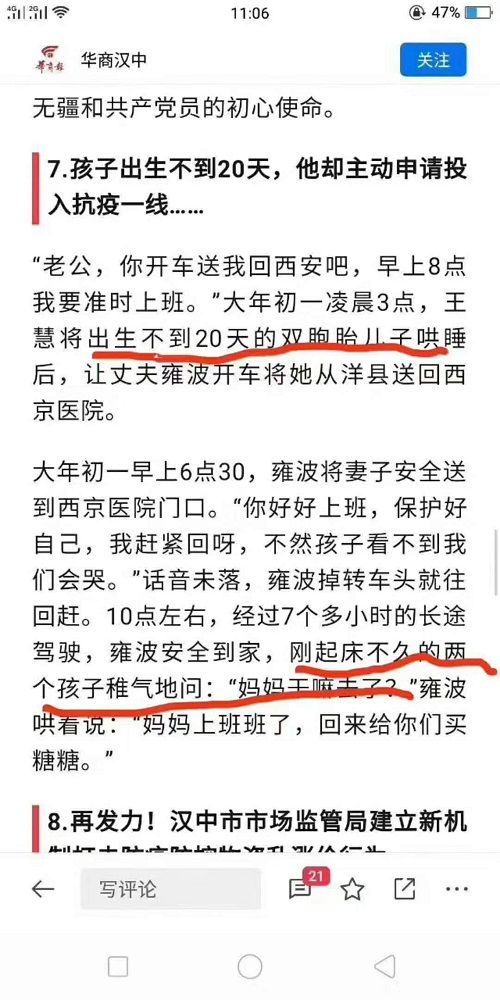 华商报,你们的新闻节操在哪儿 独立撰稿人 李海波 2月15日,“华商汉中”头条号刊发了稿件《孩子出生不到20天,他却主动申请投入抗疫一线……》,其中包含了三个抗疫一线的感人故事。新闻是这样写的:“老公,你开车送我回西安吧,早上8点我要准时.上班。"大年初一凌晨3点,王慧将出生不到20天的双胞胎儿子哄睡后,让丈夫雍波开车将她从洋县送回西京医院。年初一早.上6点30,雍波将妻子安全送到西京医院门口。“你好好上班,保护好自己,我赶紧回呀,不然孩子看不到我们会哭。”话音未落,雍波掉转车头就往回赶。10点左右,经过7个多小时的长途驾驶,雍波安全到家,刚起床不久的两个孩子稚气地问:“妈妈王嘛去子2“雍波哄着说:“妈妈. 上班班了,回来给你们买糖糖。" 16日深夜,华商报致歉书给出的解释是:稿件的标题,是以第三个故事——洋县辅警杨浪在孩子出生不到20天,即主动要求到疫情检查点执勤的内容拟定的。而本文的第一个故事,是西京医院消化科护士王惠在大年初一即辞别不到两岁的双胞胎儿子,返岗工作的感人事迹。2月16日,“华商汉中”头条号编辑在整合15日汉中抗疫大事记过程中,因工作仓促出错,将其中两个事件混淆,造成了文中“出生不到20天的双胞胎儿子”的错误,引发诸多误解。 对此致歉,撰稿人还是不服:一是文章内容本来是洋县辅警杨浪在孩子出生不到20天即要求执勤,事实属实么?坐月子中就要求上岗,这真是不要命啊?二是致歉书里写的“2月15日,“华商汉中”头条号刊发了稿件《孩子出生不到20天,他却主动申请投入抗疫一线……》,其中包含了三个抗疫一线的感人故事。”也就是说文章是2月15日发布的,但这里又说“2月16日,“华商汉中”头条号编辑在整合15日汉中抗疫大事记过程中,因工作仓促出错,将其中两个事件混淆......”你们工作严谨点好不?三是《孩子出生不到20天,他却主动申请投入抗疫一线……》文章中包含了三个抗疫一线的感人故事,但是看看发的那文章《孩子出生不到20天,他却主动申请投入抗疫一线……》编号是7,下面还有“8.再发力,汉中市市场监管局......”华商报,一个谎话十个圆,圆谎掰下手指头算算再圆好不好?! 既然这么多感人事例,为何没有图片?有记者现场采访吗?!新闻的生命是真实!没有事实就没有新闻,事实是新闻的生命。新闻的特点就是真实性、及时性、准确性!一篇新闻出笼,需要记者采写,编辑,责任编辑、主编、值班总编审核这一系列留存才会发布,这么多人把关,却管不住这一篇笑掉大牙的烂文?! 华商报,你们的的社会责任感哪去了?! -------------------------------------------------------------------------------------------- 附华商报致歉书附后的2月15日,“华商汉中”头条号刊发稿件【原稿虽然删除,但网友截图显示有8,呵呵】 《孩子出生不到20天,他却主动申请投入抗疫一线……》原文 1)“女儿,家里有我们照顾,医院需要你” “老公,你开车送我回西安吧,早上8点我要准时上班。”大年初一凌晨3点,王惠将双胞胎儿子哄睡后,让丈夫雍波开车将她从洋县送回西京医院。 王惠和雍波都是洋县龙亭镇杜村人,王惠在西京医院消化科当护士,雍波在西安创业,父母在西安帮她们照顾不到2岁的双胞胎儿子。腊月二十九,雍波一家回到洋县老家过年,同时走访多年未见的亲戚朋友,正月初八给孩子过生日。 但计划赶不上变化,新冠肺炎疫情爆发。正在吃年夜饭的时候,王惠突然接到医院上班的通知,一切计划全部泡汤。 “女儿,家里有我和你爸还有雍波,医院需要你,你赶紧回,路上小心点。”婆婆的一番话成为王惠强大的精神支柱。 夫妻两行车3个多小时,行程230多公里,平时繁忙的西汉高速,竟然没有碰到一辆车。大年初一早上6点30,雍波将妻子安全送到西京医院门口。“你好好上班,保护好自己,我赶紧回呀,不然孩子看不到我们会哭。”话音未落,雍波掉转车头就往回赶。10点左右,雍波安全到家,刚起床不久的两个孩子稚气地问:“妈妈干嘛去了?”雍波哄着说:“妈妈上班班了,回来给你们买糖糖。” 2)“儿子,等爸爸打完病毒小怪兽就回来陪你玩” “过年别人家小孩的爸爸都回来了。爸爸,你什么时候回来啊?”大年初二下午5点,正在西汉高速洋县出口疫情检查点执勤的李铎接到2岁小儿子的电话,眼眶湿润了。 李铎是江南中队中队长,中队负责的检查点是洋县重要的交通枢纽,仅大年初二就有4000多辆来往车辆。“要扎紧这个‘铁闸栏’,严防疫情向洋县扩散,不获全胜,决不收兵!”李铎立下了军令状。 李铎老家在勉县,妻子在勉县陕钢集团上班,7岁的大儿子和2岁的小儿子都留在勉县让父母照顾,母亲有糖尿病,父亲心脏也不好。今年,李铎本打算回勉县和家人团团圆圆过个年,而突如其来的疫情打乱了他的美好愿望。 “儿子,等爸爸打完病毒小怪兽就回来陪你玩,在家听爷爷奶奶话,爸爸爱你。”2月12日,李铎抽空和儿子通了一会电话。挂掉电话后,他翻开检查点的记录本,上面写着:“截止2月12早上8点,共排查车辆21329辆,体温检测28408人,未发现疑似人员。” 3)孩子出生不到20天,他却主动申请投入抗疫一线 “队长,疫情防控任务艰巨,我申请明天回来上班。” “你的孩子出生还不到20天,家里的事你能安排好吗?” “请队长放心,没有大家哪有小家,我妻子和父母都很支持我的决定。”大年三十,洋县金水中队辅警杨浪听说队友在西