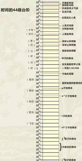 图10 孙杨夺冠之后击水庆祝 田径场的起跑器和游泳馆的起跳台上都装有电子压力板,发令枪响之后,选手在十分之一秒之内出发,就算抢跑(抢跳)。科学研究表明,人听到发令枪响后的反应时间不可能少于十分之一秒,如果少于,那就是提前启动了。游泳接力赛中,抵达队员先要触碰“触摸板”,后一棒队员才能起跳,起跳的“电子压力板”显示的起跳时间必须在触碰时间之后,不然,整个接力队成绩就会被取消。 时间还可以测多准? 看到这里,想必小伙伴们对体育运动计时器及其重要性有了一定的了解。体育计时器有很大的发展空间。大家有所不知,时间是世界上能够测量的最准的物理量,我们把地球上的时间尺度可以划分44级台阶,可以看出目前科技水平能够测量的最小的时间单位是10-18 s,能够算出的最小时间单位是10-25 s(Z0粒子的寿命)。