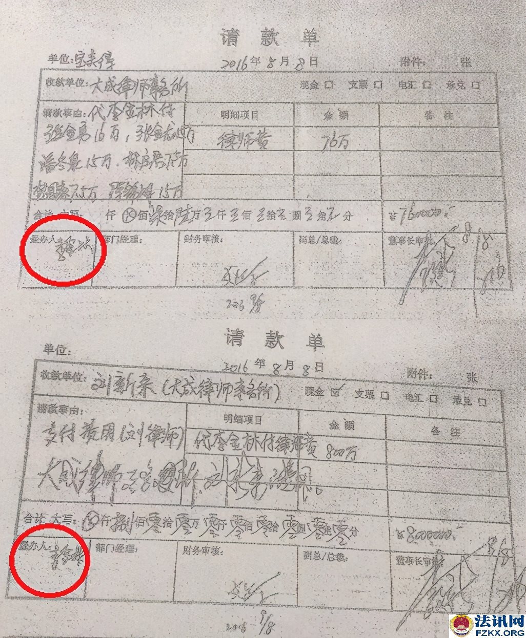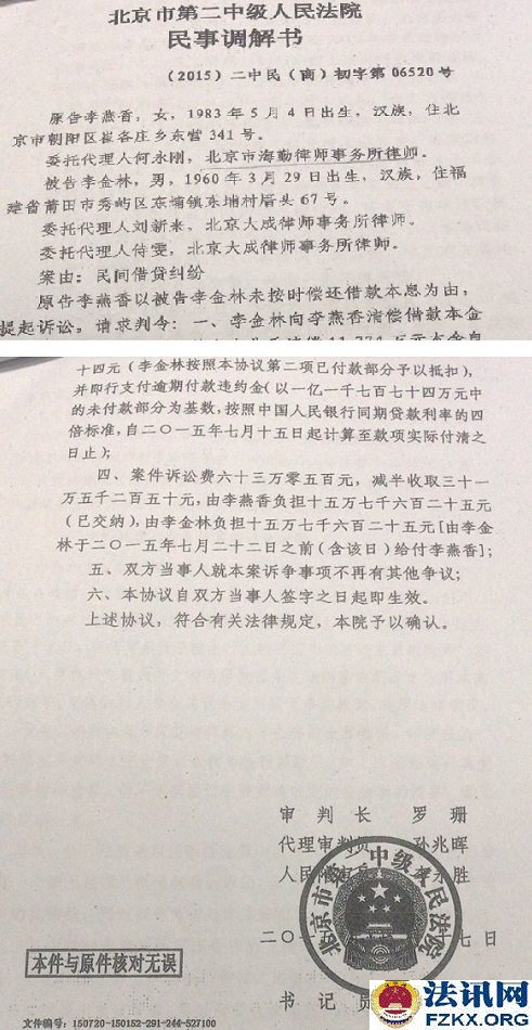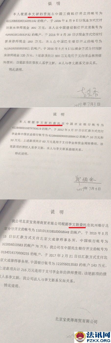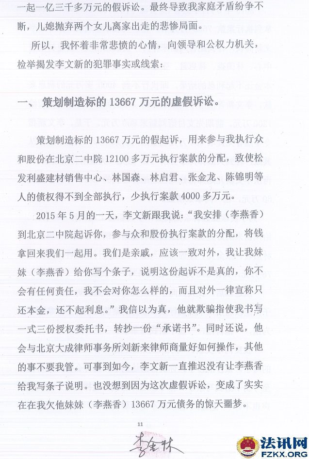 法讯君从多位莆田商人中获悉,因涉嫌虚假诉讼,莆田人李燕香、李金林被北京市公安局丰台分局刑事拘留。 李金林是莆田人,在其堂弟李文新控制的北京闽商担保投资有限公司、北京豪威特供热设备有限公司等公司打工,干了近30年。莆田黄璋宝特大集资案被列入2016年十大非法集资大案,涉案金额49亿余元,涉及200余家企业,受害者多为福建莆田人,数目超过1000人,该案致6人死亡。内心受到煎熬而良心发现的李金林于2019年12月12日,愤而向北京市政法机关领导检举揭发李文新重大犯罪行为和线索,其中第一条就是策划制造标的13667万元的虚假诉讼。该案件用来参与李金林执行众和股份在北京二中院12100多万元执行案款的分配,致使五名莆商的债权得不到全部执行,少执行案款4000多万元。 李燕香是李文新的妹妹,在李文新多家公司里负责财务。 北京市中级人民法院(2015)二中民(商)初字第06520号民事调解书显示,李燕香与李金林共同确认:截至二0一五年七月十五日,李金林尚欠李燕香借款本金一亿一千七百七十四万元、利息三千四百八十二万九千四百五十四元,共计一亿三千二百五十六万九千四百五十四元。 笔迹鉴定这里的李金林签字非李金林书写 检举信里,李金林述说了虚假诉讼的情况。 2015年5月的一天,李文新跟我说:“我安排(李燕香)到北京二中院起诉你,参与众和股份执行案款的分配,将钱 拿回来我们一起用。我们是亲戚,应该一致对外,我让我妹妹(李燕香)给你写个条子,说明这份起诉不是真的,你不会有任何责任,我不会对你怎么样的,而且对外-律宣称只还本金,还不起利息。”我信以为真,他就欺骗指使我书写一式三份授权委托书,转抄-份“承诺书”。同时还说,他会与北京大成律师事务所刘某某律师商量好如何操作,其他的事不要我管。可事到如今,李文新一直推迟没有让李燕香给我写条子说明。也没想到因为这次虚假诉讼,变成了实实在在我欠他妹妹(李燕香)13667万元债务的惊天噩梦。 2016年6月,李燕香拿到执行案款7655万元后,北京大成律所刘某某律师与李文新商议,让我配合刘某某律师,设法让松发利盛建材销售中心、林国森、林启君、张金龙、陈锦明等债权人达到只还本金还不起利息的结果,即执行不到4000多万元的利息案款,李文新答应给予刘某某律师30%的回报,即李文新应给1200万元,前期先支付给刘新来800万元。于是,李文新指令李燕香先提取600万元现金给刘某某律师,又由李燕香从其账户转到大成律师事务所140万元(大成所开具发票),再从李文新儿媳郑梅妹处已经结算给我的2012年业务提成60万元,也一同拿来凑数。 为了使该虚假诉讼更真实,李文新将上述共计800万元给刘某某的好处费,加上松发利盛建材销售中心、林国森、林启君、张金龙、陈锦明等人由李文新支付的应诉律师费用76万元,共计876万元,让我书写一个欠条。 从这以后,我天天向李文新要证明该起假诉讼的证明条子,他以北京二中院执行众和股份的案款还没有全部拿到手为由,一拖再拖,一直不给我写条子。 我质问李文新:“我已经按照你的吩咐做到位了,该写的写了,该抄的抄了,你的目的达到了,为什么你一拖再拖至今仍不给我写条子?你不该这样害我,这样的话,你的名声也不好!”他说:“你以前不是说要自杀吗?到现在不是还没有自杀吗?”他还扬言,我钱没有他多,社会关系没有他硬...... 该起虚假诉讼的被告律师费用由原告支付,这是开具的800万元部分发票。据了解,该诉讼的李金林的800多万元律师费其实是由李文新给付的。 李文新儿媳、妹妹及宝美得公司的说明,证明是受李文新委托。员工是给老板打工、老板指到那里员工打到那里,员工犯错被依法刑拘、那么得利的老板逍遥法外?(李海波) |