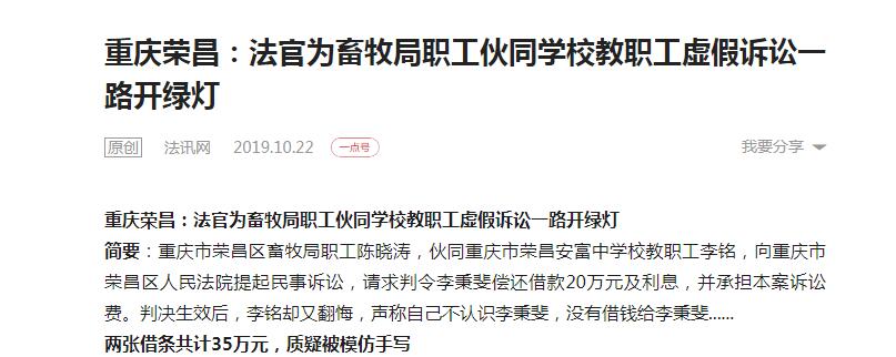 法院作为国家的审判机关,是充分运用审判职能作用,通过审判活动,向社会昭示和评断是与非、美与丑、善与恶,实现司法公正的国家机关。同时也是司法文明的实践者,社会主义精神文明的倡导者和传播者。 在重庆市荣昌区人民法院,发生了这样一件事情:荣昌区畜牧局职工陈晓涛、重庆市荣昌安富中学校教职工李铭两人作为原告,向法院状告李秉斐要求偿还借款20万元及利息;原告陈晓涛向法院状告李秉斐要求偿还借款15万元及利息,并承担本案诉讼费。在法院审理举证时,原告陈晓涛只向法院提供了被告李秉斐(下称:被告)的银行交易明细,没有向法院提供自己的银行交易明细,最后法院判决居然认定了借贷关系成立。而且,在审理前后,庭审记录及判决书均有被告的详细地址及知晓家人的情况,却采用报纸公告的形式送达。在原告申请执行的时候,法院又通过邮局将执行决定送达,后又到被告姐姐的门市,让被告的姐姐转告被告去法院应诉。而且原告、被告、法院均在同一个城市。 法院为什么会这样做呢?这中间是否有什么猫腻?笔者对此事进行了深入调查。 采用公告送达掩人耳目 拖延时间造成申请再审逾期 《民事诉讼法》规定:法院公告送达有严格条件的,一是受送达人下落不明;二是用其他方式(包括直接送达、留置送达、邮寄送达等)无法送达到的情况下。所谓送达人下落不明是指受送达人无固定的住址,也无法查明现在的住址,下落不明,使人民法院无法采用直接送达的方式向当事人送达诉讼文件。要求⑴立案时应该要求当事人提供双方当事人目前的详细地址和联络方式。当事人是自然人的,要提供当事人的身份证明、户籍证明;⑵送达时未找到被送达人或者邮寄送达诉讼文书被退回的,应当查清被送达人是否因临时外出或迁移新址无法送达到;⑶确认被送达人下落不明应该有公安部门或其单位、街道办事处的证明材料予以证实,必要时要对被送达人的近亲属进行调查询问。 从被告代理律师从法院复印的原告起诉状中看到,被告的地址为重庆市荣昌区昌州街道东益花园22号2单元5-2,与身份证住址重庆市荣昌区(县)东大街57号一单元4-2不符。重庆市荣昌区人民法院受理原告陈晓涛、李铭状告李秉斐偿还借款诉求后,立案时原告是否提供被告的身份证明、户籍证明?难道就凭一个起诉状,两张借条就立案受理了?难道原告不核实被告家庭住址和身份证明就能将35万元钱借出去? 在审理过程中,作为审判长的晏兵在之前庭审中核对当事人身份情况时,已经知道被告住址在重庆市荣昌区东大街57号1单元4-2并记入庭审笔录,应将两份判决书直接送达或邮寄送达,便于被告如果不服该判决有时间上诉。然而,在荣昌区法院在作出判决次日,既是审判长也是案件承办人的晏兵,又通过人民法院报公告送达。 法院在已经知晓了被告住址的情况下,却还是用登报形式进行送达,而且登的是市面上买不到看不到的人民法院报,这样做无形之间将判决后提出再审的机会减少了很多。法院这样做究竟是何目的呢? 原告提供的被告银行交易明细与被告自己提供不符 法院却认定借贷关系成立 相关法律法规:《中华人民共和国民事诉讼法》第六十四条:当事人对自己提出的主张,有责任提供证据。当事人及其诉讼代理人因客观原因不能自行收集的证据,或者人民法院认为审理案件需要的证据,人民法院应当调查收集。人民法院应当按照法定程序,全面地、客观地审查核实证据。《最高人民法院关于民事诉讼证据的若干规定》第二条:当事人对自己提出的诉讼请求所依据的事实或者反驳对方诉讼请求所依据的事实有责任提供证据加以证明。没有证据或者证据不足以证明当事人的事实主张的由负有举证责任的当事人承担不利后果。人民法院应当按照法定程序,全面地、客观地审查核实证据。 2014年3月2日,被告急需资金周转,向原告陈晓涛出具了一张借条,金额20万元,限期两个月内还清,口头约定利息4.7万元。并在借条上添加了一个被告既不认识、又不在现场的李铭(原告)的名字。借条写好后,原告陈晓涛转存15.3万元到被告农业银行账户交易日期时间是2014年3月2日11时48分58秒。2014年5月4日,被告又向原告陈晓涛出具了一张借条,金额15万元,限期两个月内还清,口头约定利息6.6万元,借条写好后转存8.4万元到被告农业银行账户,交易日期时间是2014年5月4日16时43分02秒。两张借条共计35万元,扣除利息11.3万元后,实际转款23.7万元。李秉斐从2014年3月2日借第一笔款后开始还款,从2014年3月6日到2014年9月6日,陆陆续续还了32万元。后因原告陈晓涛、原告李铭起诉,2017年5月26日通过荣昌区法院又执行了5.33万元,一共还了37.33万元。 事情本该就此结束了,然而,原告陈晓涛手里还持有两张借条:只是借款日期变成了2014年8月3日和2014年8月24日,两张借条合计金额还是35万元。 但是被告称:除2014年3月2日、2014年5月4日向原告陈晓涛借过两次钱后,再没有向他借过钱,根本没有在2014年8月3日、2014年8月24日两张借条。 2016年6月20日,陈晓涛和李铭将李秉斐告上法庭,要求偿还2014年8月3日的借款20万元。同日,陈晓涛也将李秉斐告上法庭,要求偿还2014年8月24日的借款15万元。立案后,因被告没有到场,法院便作出了被告归还共计35万元的借款,并按照判决支付利息的判决。 后被告不服法院判决,便通过律师调取复印了原告陈