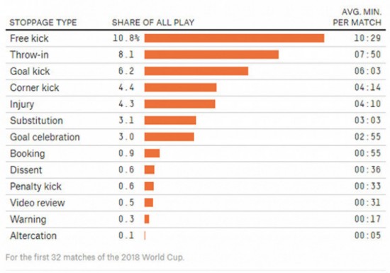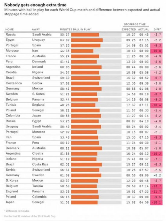 因为无法随时停表,所以每场足球赛的持续时间完全取决于裁判的判断力。同时,这也影响了球队的策略:当比赛进入最后阶段,占据领先优势的一方往往会选择拖延时间以维持胜局。 考虑到这一点,一家名为FiveThirtyEight的网站研究了俄罗斯世界杯小组赛阶段的前两轮比赛,试图检验裁判员对每场比赛伤停时间的把握。为此他们记录了32场比赛的所有暂停时刻:共3194次,或者说,每58秒一次。 最后,该网站得出了一个结论:实际的有效比赛时间很大程度上被错误估算了,仅有一场比赛得到了足够的补时。根据官方数据,所有这32场比赛的平均补时时间为6分59秒,然而根据该网站的计算,每场球赛上下半场的补时总和应为13分10秒,几乎是官方给出的2倍。
