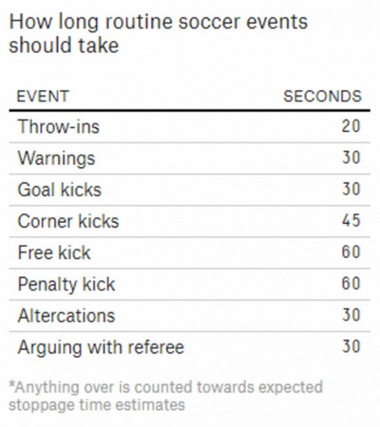 每场比赛的活球时间、预计补时时间与真实补时时间(数据来源:FiveThirtyEight) 然而,要计算足球比赛中断的时间并不是每次球出界时暂停秒表那么简单。 尽管国际足联的官方规则中标明了一些关于计算时间损耗的具体准则:应予补足包括由于替换队员、对队员伤势的评估、将受伤队员移出比赛场地进行治疗、浪费的时间以及其他任何原因(例如庆祝进球)损失的时间,但该规则中还写道:“补充的时长由裁判员酌情决定”。可见,补时这一项上,国际足联给裁判留下了较大的自由量裁权。 在所有损耗时间的环节中,最容易统计的是死球时间(当球不论在地面或空中全部越过球门线或边线时;当比赛已被裁判员停止时),但值得注意的是,光这一项的平均值就比官方给出的场均补时时间多了大约5分钟。另外,在国际足联的规则里,对于球员开出界外球、门球、任意球和角球时浪费的时间并无明确规定。 FiveThirtyEight网站认为,为保证比赛的公平性与有效性,上述时间损耗不应当被看作比赛的一部分,而应当被算作补时的一部分。 为了阐释这一点,该网站在进行了大量的研究与比对之后统计出了一场足球比赛中各项活动的平均耗时,并以此为基准计算球员们究竟浪费了多少时间。举例而言,在这一组基准数据中,一位门将开门球的时间约为30秒,也就是说,如果某位守门员花了41秒才将球从球门区踢出,那么他就有11秒的过度耗时,而这11秒应当被加入补时之中。