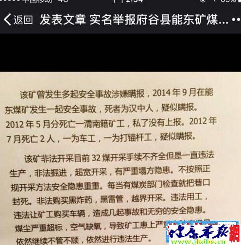 陕西府谷县能东煤矿再出安全事故瞒报 特约撰稿人 李海波 有网友向撰稿人爆料:2016年9月7日,府谷县能东煤矿矿井三改四拉煤车辆发生事故,造成一人死亡,随后施工队把死亡者拉到鄂尔多斯东胜殡仪馆,于11日中午火化,之后双方私了,给家属赔款119万。据了解死亡矿工为蒙涛,西安临潼人。事后矿方与死者家属私了,家属获赔119万元。 矿方花32万元封口二记者 4万元买通殡仪馆档案室主任 随后先后两次有记者采访调查,矿方花30余万予以封口。有一记者因收12万被人举报,用08年的别克凯越小轿车作为交易。 之后该事被人举报到榆林市,市里便成立检查组。在检查组到鄂尔多斯火葬场之前,能东煤矿就接到通知,说是有市里去鄂尔多斯查询死亡事件。能东煤矿王总马上通知施工队老板叶从国去鄂尔多斯的东胜殡仪馆摆平此事件。不然煤矿所以损失都有施工队承担。 11月23日,施工队老板连夜赶到鄂尔多斯找到东胜殡仪馆档案室一姓余主任,给其4万元现金,24日早上八点半左右,刚提出出事矿工的火化档案来,榆林市的工作组就去了。 至此榆林市工作组没有查到任何情况,工作组要求将档案室余主任开除,查无此人证明,此事就此了结。知情人特将此事举报给记者说:希望严查,给煤矿职工带来一个安全的煤矿工作环境,本人代替所有矿山民工们谢谢你们了。 近年来能东煤矿瞒报多起矿难 县政府漠视采访 网上有人曝出能东煤矿近年来瞒报多起安全事故:2012年5月瞒报一起死亡1人事故;2012年9月瞒报一起死亡2人事故;2012年9月瞒报一起死亡1人事故。 还有人爆料称能东煤矿在2015年6月也有一起矿难事故被瞒报:重庆市开县金峰镇富民村的刘柏林负伤后在神木县医院死亡,赔偿90多万元后私了。 读者爆料是否属实?署证记者于2016年12月27日下午传真至府谷县人民政府核实。 直到1月5日的15:50分,09128713356致电核实函中的电话,称是府谷县政府的,说传真的内容看不清,并告诉了其邮箱。当即记者将内容发给773742338@qq.com,但直到发稿,也没有得到府谷方面任何回应。 2016年12月14日,法讯网发布了《陕西府谷沙沟岔煤矿频出伤亡事故并瞒报,1年里9死8伤 巨资赔偿家属、摆平记者》的文章,之后转载网站多达百家。12月28日本地媒体《西安商报》记者对此前往府谷县政府和煤矿采访,却遭遇闭门羹。 而据该文撰稿人李堂平透露,文章发布后就接到了榆林市安监局副局长张文林的弟弟张文琪来电威胁说要弄死作者。之后也有人找到李堂平亲戚,要其注意安全。而其11月15日发给府谷县长信箱、11月16日发给榆林市长信箱、11月22日发给陕西省安监局的投诉,也均没有任何回应。 如此,撰稿人生疑了:难道府谷县是法外之地,只为发展经济而不顾矿工们的生死安全? |