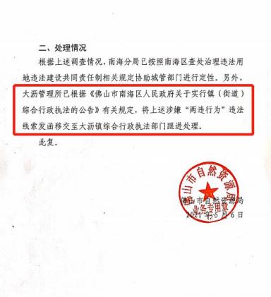 为什么专项整治下 佛山大沥的违建越查越建 近日,佛山市纪委监委出台《关于持续深化基层执法领域侵害企 业和群众利益突出问题专项整治的工作意见》,决定在更大范围、更 宽领域、更深层次上持续深化基层执法领域侵害企业和群众利益突出 问题专项整治,整治领域包括城市管理等与企业和群众利益息息相关、与营商环境高度关联的基层重点执法领域。 整治重点锁定基层重点执法领域充当不法分子“保护伞”等以权 谋私问题;选择性执法等滥用职权问题;对群众合理诉求推诿扯皮、冷硬横推,执行上级决策部署不力,有法不依、执法不公、执法不严、违法不究等失职失责问题。 根据佛山市党风廉政建设暨廉洁佛山建设领导小组办公室近日 印发的《关于开展佛山市党政机关作风突出问题专项整治的工作方案》 (以下简称《方案》),佛山正重点聚焦各级党政机关党员干部和工 作人员存在的“庸、懒、散、拖、乱”等突出问题,在全市开展党政 机关作风突出问题专项整治。 此次专项整治范围为全市党的机关、人大机关、行政机关、政协机关、监察机关、审判机关、检察机关,以及人民团体和参照公务员 法管理的事业单位的党员干部和工作人员。今年7月至9月为专项整 治阶段,之后转为常态化整治。 佛山大力专项整治阶段,佛山南海大沥镇在村改攻坚方面,突出狠抓落实村级工业园的拆除工作。 据 2021年8 月16 日的《今日头条》《大沥发布》介绍,大沥镇目前已累计整理拆除村级工业园 1.5348 万亩。2021 年上半年,大沥紧盯 5100 亩的全年村改目标,已完成拆除改造 2636 亩,完成率超50%。 下半年,大沥将继续推进2464亩村改任务,确保今年完成5100亩、2023 年前完成11400亩拆除改造任务,为发展腾出空间,加快城乡融合、村改攻坚的步伐,助力大沥乃至南海高质量发展。 大沥倒排“时间表”,啃下“硬骨头”。实施挂图作战,9 月底 前完成太平社区 350 亩的工改工土地整理协议签署,今年底完成奇槎 奇西项目、桂澜路北延线项目、盐步水闸区域、大沙区域以及沿江片区等合计 1500 亩的拆除改造。 用足“好政策”,推动“连片改”。充分利用“毛地入市”政策,加快村级工业园、专业市场改造。其中,沥北湖马工业园 164亩项目争取本月底完成竞标;推进大转湾片区581亩专业市场升级改造,夹 板城龙船洛地块、盐步家具城计划9月完成挂网。 拿出“硬手段”,形成“大合力”。持续加强综合执法整治力度,利用全链条约束工作机制,提高执法效能,加快产业空间重构和生态空间腾退,为安全产业、泛家居、新材料、智能制造、时尚设计、现代商贸提供发展空间。 在当前,佛山大力整治执法力度的同时,为什么佛山市南海区大沥镇溪一股份经济合作社范围内的三处违建 “诚丰美食” “OYO 穗 都酒店” “帆柯工业大楼”越查越建?群众多次向佛山市南海区城市管理和综合执法局、佛山市南海区大沥镇查处治理违法用地违法建设共同责任制领导小组办公室、佛山市南海区大沥镇综合行政执法办 公室、向佛山市纪委实名投诉举报,佛山群众 6 次向佛山市 12345 实 名投诉,该违建在边查边建中公开使用违建营业了,至今没有拆除。 佛山市南海区城市管理和综合执法局(南城管信〔2021〕28 号) 《佛山市南海区城市管理和综合执法局关于陆啟斌等人信访事项的答复意见书》答复:“上述两处涉嫌违建物的处理不属我局职能范围,我局已将上述线索发函至相关部门跟进处理。” 而佛山市自然资源局也就此问题书面回函答复:“未办理相关规 划审批手续,涉嫌存在违法建设行为。” 对群众举报的佛山南海大沥溪一的三处违建拆除职责,佛山市南海区城市管理和综合执法局书面答复不属于我局的职责,佛山市自然资源局答复已将两违行为移交至大沥镇综合执法部门处理,两个执法部门相互推卸责任,至今没有拆除三处违建。 佛山南海大沥三处违建情况 1.南海区大沥镇盐步联河路(穗盐路以上北 500 米处右边)“诚丰美食”占用公共用地 3000 平方米的违法建设(2021 年3 月2日拍摄) 2.佛山南海大沥镇盐步河西社区新德村(村前桥头北侧)的“帆柯工业大楼”工厂总建筑面积为 3473.18 平方米的违法建设(2020 年11月16日勘察) 佛山市南海区城市管理和综合执法局于 2020 年 3 月 26 对上述违 建进行了现场勘查,并对当事人梁锡流做了笔录,执法人员现场拍摄 的照片显示违建尚未封顶,正在建设之中,但实际执法的情况越查越 建,不仅当事人公开进行建设,而且在执法人员的“执法”中建成使用,利用违建对外公开营业,至今没有拆除,像这样的违建情况在佛 山大沥普遍存在。相反,在紧邻上述违建被佛山大沥列入土地整理范围内的其他厂房建筑,佛山市南海区城市管理和综合执法局却以迅雷不及掩耳的速 度进行强制性拆除,有选择性执法的现象。 当前,中央正在开展违法建设专项清查工作,在违法建设专项治理工作五年行动方案的背景前提下,要求对新增违法建设实行零容忍,发现一起,查处一起,建立健全违法建设快速拆除机 制,对发现的新增违法建设要立即予以制止,坚决刹风止乱。 希望佛山南海大沥城管执法部门会对辖区的违建有一个公正的处理结果,以便营造佛山市人民群众的良好生活环境。 |