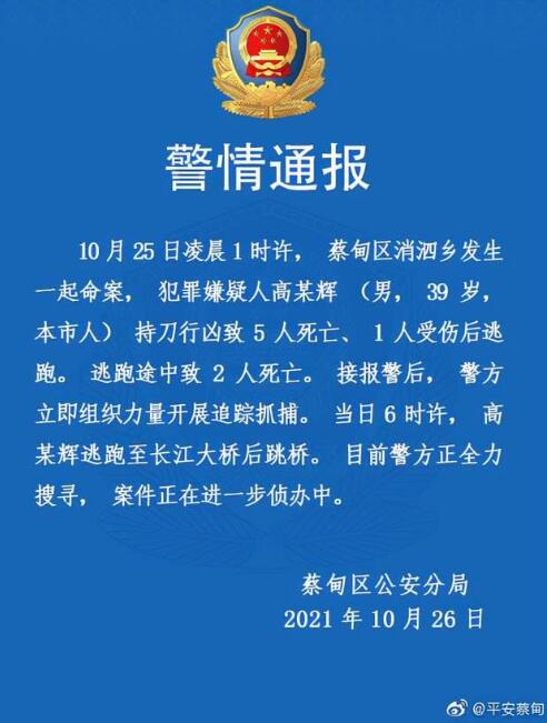 据@平安蔡甸 消息,10月25日凌晨1时许,蔡甸区消泗乡发生一起命案, 犯罪嫌疑人高某辉 (男,39 岁,本市人) 持刀行凶致5人死亡、1人受伤后逃跑。 逃跑途中致2人死亡。 接报警后,警方立即组织力量开展追踪抓捕。当日6时许,高某辉逃跑至长江大桥后跳桥。 目前警方正全力搜寻,案件正在进一步侦办中。