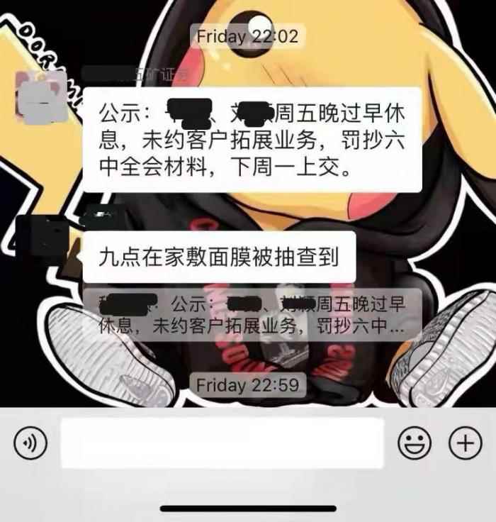原标题:活久见!五矿证券员工周五晚在家敷面膜被罚,原因竟然是过早休息,耽误加班…… 21世纪经济报道记者李域 深圳报道 12月21日,又一则来自券商的处罚信息引发金融圈热议。 近日,五矿证券固定收益部两名员工因周五晚过早休息,未约客户拓展业务,被罚抄六中全会材料,其中一人的具体原因竟然是:“晚上9点在家敷面膜被抽查到,耽误加班。” 多位业内人士表示,前有中信证券经纪人替客户考研被抓,后有五矿证券晚上敷面膜被罚,证券行业为了业绩,还要有多拼? 业绩体现能靠面膜吗? 据介绍,五矿证券相关部门有晚上随机打电话抽查的惯例,在当事人被抽查到时,自己说正在敷面膜,因此被点名批评,并公示处罚。 ![]() 21世纪经济报道记者获悉的一张图片显示,有公司领导对处罚进行点评,“新人如果周五晚上九点在家敷面膜,那业绩的体现也能靠面膜吗?知耻而后勇吧。” 当事人对此回应:“打工人打工魂,碰碰业务人上人。” “敷面膜也不一定耽误加班看报告、写材料。”有证券业内人士表示,“主要还是竞争太激烈,业绩压力太大了”。 一位五矿证券的内部人士透露:“固收部门从来都是五矿最赚钱的部门,每年贡献数亿的收入绩效。” 公开资料显示,五矿证券成立于2000年,是一家综合类证券公司,注册资本金为97.98亿元。 作为一家综合类证券公司,五矿证券经营范围涵盖证券的各个业务线,包括证券经纪、投资银行、资产管理、信用业务、证券投资与交易等,并通过五矿金通、五矿金鼎两家子公司开展私募股权投资和另类投资业务。 中国证券业协会公布的数据显示,在证券公司2020年经营业绩指标排名情况表中,五矿证券的2020年度投资银行业务收入6.42亿元,在全行业99家排名27,其中债券主承销佣金收入共计4.41亿元,业内排名18,具有较强的竞争力。 其他的业务方面,资产管理业务收入行业排32名,经纪业务收入排名86名。 人均效能考核模式 事实上,据五矿证券人士透露,其他业务部门也面临很大的考核压力。 比如资管团队,“今年开始调整绩效考核模式为人均效能,资管部总共有十几个团队,最后可能只留下人均效能高的几个团队。” 公开数据显示,在资管业务方面,五矿证券2020年资管受托管理规模突破700亿元,主动管理占比超过70%。 此外,投行业务也是五矿证券的发力点,2020年,五矿证券投行业务公司债和企业债承销金额排名均跻身行业前20名。 值得注意的是,在业务快速发展的同时,五矿证券也出现违规和受到处罚。 今年四月,五矿证券一个月内曾两次受到监管处罚,其中就有关于投行业务的监管处罚。 4月6日,因违反了《证券发行上市保荐业务管理办法》第五条规定,五矿证券在首次提交的保荐工作报告等材料中,未披露发行人重要子公司苏州市信测标准技术服务有限公司涉嫌行贿的事项,被证监会采取出具警示函的监管措施。 同月的12日,五矿证券收到另一监管处罚。 广东证监局网站的消息显示,五矿证券陈权在担任五矿证券有限公司广州华夏路证券营业部负责人期间存在从事其他经营性活动的行为。该行为违反了《证券公司董事、监事和高级管理人员任职资格监管办法》第三十七条和《证券期货经营机构及其工作人员廉洁从业规定》第十条的规定。根据《证券期货经营机构及其工作人员廉洁从业规定》第十八条的规定,广东证监局决定对陈权采取出具警示函的监督管理措施。 不过,在最近的公开发言中,五矿证券有限公司党委书记、董事长郭泽林表示,在董事会、经营管理层的领导推动下,五矿证券已建立健全了合规风控管理机制,搭建切实可行的合规风控管理体系,使合规风控管理覆盖公司前、中、后台。 2021年上半年,五矿证券实现合并营业总收入10.6亿元,同比增35.18%,净利润2.3亿元,同比增6.33%。 (作者:李域 编辑:朱益民) |