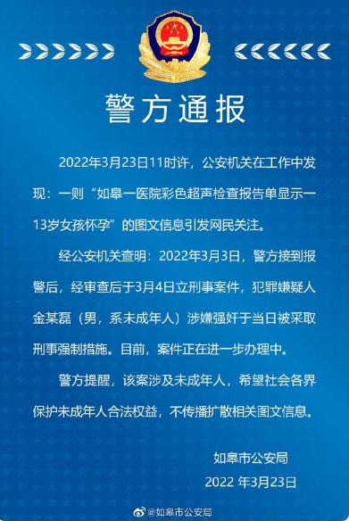 3月23日,江苏如皋市公安局(@如皋市公安局 )发布警方通报: 2022年3月23日11时许,公安机关在工作中发现:一则“如皋一医院彩色超声检查报告单显示一13岁女孩怀孕”的图文信息引发网民关注。 经公安机关查明:2022年3月3日,警方接到报警后,经审查后于3月4日立刑事案件,犯罪嫌疑人金某磊(男,系未成年人)涉嫌强奸于当日被采取刑事强制措施。目前,案件正在进一步办理中。 警方提醒,该案涉及未成年人,希望社会各界保护未成年人合法权益,不传播扩散相关图文信息。 ![]()