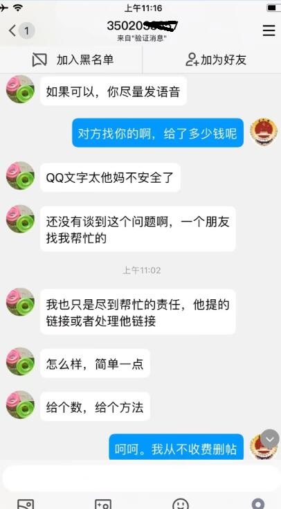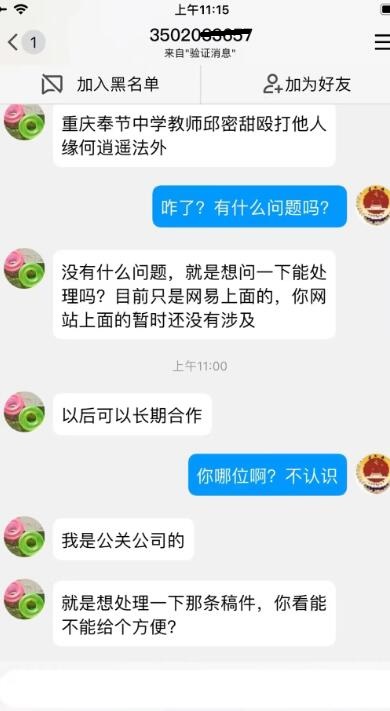发布奉节中学教师邱蜜甜打人后,公关、公安急删帖为哪般 昨日上午(2月23日)法讯网转发了中国民声网发布的帖子《重庆奉节中学教师邱密甜殴打他人缘何逍遥法外》,之后转发到网易号。在上午10时50分,有人加法讯QQ,在询问何事时,如下沟通。 对方:稿件能秒吗? 法讯问:秒啥。 对方:你网易号的一个稿件,我们是同行,我受他人委托 刚又加了你微信 法讯:啥意思?发链接 对方:奉节,那条 一个小时左右发的那个