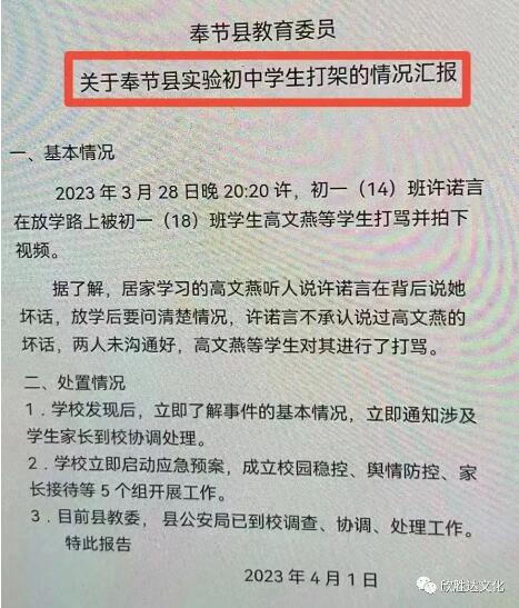 夜晚施暴 (很抱歉,不论怎么处理视频,都发不出,只能截屏。) 校园霸凌确实是社会顽疾,并且有着“低龄化”的趋势。上世纪八九十年代主要发生在高中,现在主要发生在初中,甚至有向小学蔓延的趋势。这或许是由于现在的青少年普遍早熟的原因:高中生意识到了校园霸凌的危害性(甚至可能负刑责),所以变少了,但是初中生、小学生还是觉得“一哥”“一姐”很耀眼。 笔者想起了上月的一件事情。朋友儿子在南岸区某小学上六年级,学校不允许学生带现金进学校,但是这个孩子没有遵从学校规矩,由此引发一系列事情。几名同学见他身上有钱,就围着他强行“借”钱,迫于人多势众的淫威,他“借”给了他们为数不等总共一二十块钱。晚上回家后孩子越想越气、越想越委屈,决定去找他能找到住处的两位“借钱”同学把钱要回来。他母亲知道后就拦住了他,问我怎么处理比较好。我说肯定先把情况告诉班主任,班主任应该会找学生及他们家长谈话。朋友说如果班主任不负责任、随便敷衍一下怎么办?孩子太委屈,家长看着不仅心疼,心里更有气。我说,如果那样,我就去找那几个孩子,找他们家长去说话。当然,班主任老师很好地处理了这件事情——孩子们不仅归还了“借款”,也向孩子道了歉,家长们也向朋友道了歉。学校、班主任老师负责任的态度让事情得到圆满解决,如果学校不管,我代表孩子母亲去“管”,那就会演变为一场“大人之间的大事件”。 如果那则公文属实,那奉节县教委眼里的“打架”毫无疑问是一起校园霸凌事件,不仅发生在白天,还有夜晚,你看那扇人耳光后还帮着受害者梳理散落面庞头发的样子,确实很“姐”很“酷”,对那位羸弱的小女生身体造成的伤害容易恢复,但心理的伤害必定久久不能散去,甚至伴随终身。学校霸凌事件难道真的就成了不治之症?如果都像奉节县教委这样不负责任,那它真的就是不治之症。你还敢将孩子交到奉节的学校吗? 来源:微信公众号 欣胜达文化 作者:江山一目十万里