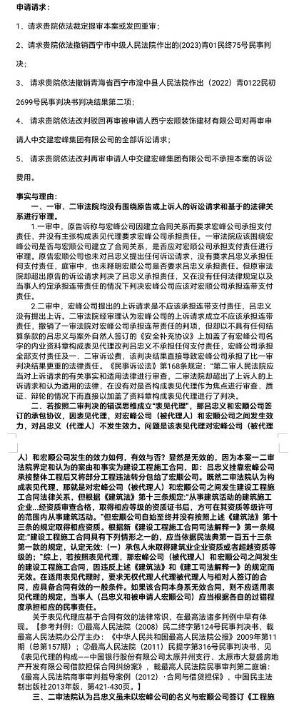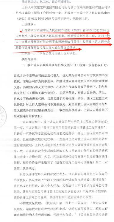 西宁中院出奇葩判决:支持上诉人请求,反而判决上诉人承担责任 独立撰稿人 李堂平 众所周知,刑事案件的上诉是不加刑,民事案件是判如所请。然而,撰稿人手中的青海省西宁市中级人民法院(2023)青01民终75号民事判决书却令人啼笑皆非:西宁中院一方面判决认定上诉人宏峰公司的上诉理由成立,应予支持,撤销了一审法院作出的(2022)青0122民初2699号民事判决中关于上诉人宏峰公司承担连带责任的判项,但却将一审法院原本判决给实际施工人吕忠义对被上诉人宏顺公司应承担的工程款和利息及诉讼费的责任全部判令由上诉人宏峰公司承担! 案件经过: 2016 年3月,上诉人公司中标案涉项目,合同签订后,由于开工时候遇到无法克服的困难,上诉人公司只好将该工程转包给实际施工人吕忠义。由实际施工人自行组建了项目部,自行聘请了人员、材料、设备等进行了施工,项目于2018年3月竣工验收,2018年10月25日审计结算完毕,审定金额为114758171.41元(详见下列工程结算审核定案表)。 2019年5月31日,宏峰公司与实际施工人吕忠义结算完毕,将全部工程尾款支付给了实际施工人。实际施工人出具《承诺书》、《确认书》、《收条》,确认收到宏峰公司114758171.41元。 实际施工人吕忠义出具收条,确认从宏峰公司收到工程款114758171.41元。该项目所有款项已与宏峰公司全部结清,如该项目今后产生的一切法律责任与经济责任以及维修保养责任等均由本人承担,与宏峰公司无关。 2022年6月,被上诉人以与上诉人公司存在合同关系为由向西宁市湟中区人民法院提起了诉讼,上诉人公司申请追加实际施工人吕忠义为被告。湟中区人民法院作出一审判决,判决实际施工人对原告承担支付责任,上诉人公司承担连带支付责任。 西宁市湟中区人民法院作出的(2022)青0122民初2699号民事判决书认为:被告吕忠义从事的是被告宏峰公司承包建设的项目,故被告宏峰公司对原告的工程款应该承担连带责任。 宏峰公司不服西宁市湟中区人民法院作出的一审判决,向西宁市中级人民法院提起上诉,西宁市中院于2023年3月22日组织开庭询问,27日即作出(2023)青01民终75号民事判决书,支持了上诉人宏峰公司的上诉请求,撤销了一审法院对宏峰公司承担连带责任的判项,但却在实际施工人没上诉的情况下改判实际施工人吕忠义不承担责任,由上诉人宏峰公司对被上诉人宏顺公司承担全部支付责任。 二审判决书 接到西宁市中级人民法院作出的(2023)青01民终75号判决书后,宏峰公司实在没搞明白为何西宁市中级人民法院作出上述判决结果,特将该案件的情况放到网上,恳请广大网友帮忙分析一下,西宁市中级人民法院作出上述判决的结果到底有没有事实根据和法律依据?程序是否存在违法? 宏顺公司对宏峰公司提起诉讼最重要的证据是实际施工人吕忠义个人与其签订的《工程施工承包协议》,但该协议上没有任何地方体现宏峰公司字样,也无宏峰公司任何印章。 吕忠义在庭审中明确该项目部由其自行组建,其是宏顺公司合同的相对方,是代表个人与宏顺公司签定该协议,自始至终没有代表过宏峰公司,愿意根据合同相对性承担义务。(详见一审笔录第8页被告吕忠义的答辩意见以及二审询问笔录第3页),宏顺公司提交给一审法院的《延期开庭申请书》也是以因要与吕忠义进行结算作为理由而申请延期开庭,证明宏顺公司也认可吕忠义才是其合同相对方,其并非要与宏峰公司进行结算。 宏顺公司提交一审法院的《延期开庭申请书》,宏顺公司明确告诉法院要与吕忠义进行结算,并非宏峰公司。 二审法院认定吕忠义未以宏峰公司的名义与宏顺公司签订《工程施工承包协议》,但却认定吕忠义与宏顺公司签订的《安全补充协议》中加盖的甘河工业园区多巴镇农贸市场建设项目内业技术资料专用章构成表见代理,故宏峰公司之间形成挂靠关系。而二审法院判决构成表见代理的重要证据《安全补充协议》上,宏顺公司并不是一方当事人,是吕忠义个人与案外人工人班组长签订的,并且该协议明确仅本着安全生产之根本的共同目的,该协议甚至无任何结算条款。并且该资料章上明确注明“只与业主、监理方内部资料往来使用,其他无效资料专用章”,不管是宏顺公司,还是案外人,均不是该资料章明确的用章主体业主和监理方,那么该《安全补充协议》咋就对宏峰公司构成了表见代理? 离谱的是,经过庭后多方寻找证人核实,案涉《工程施工承包协议》和《安全补充协议》上吕忠义的签名竟然是案外人代签,并非吕忠义本人所签。《安全补充协议》是涉及现场安全管理问题而与工人代表签的,宏顺公司并没在现场参与该《安全补充协议》的签订,上面的资料章也并非吕忠义加盖。并且宏顺公司在签订《工程施工承包协议》前就已经知道宏峰公司不参与施工,其并非与宏峰公司建立合同关系。《安全补充协议》是在《工程施工承包协议》之后签订的。证人也证实宏峰公司未刻制该资料章,也未授权使用该资料章。(证人证言已经作为新证据提交给青海省高院)。 对此案,有法学教授认为:一、二审法院均存在程序违法和适用法律错误的问题。 1.一审中,原告诉称与宏峰公司因建立合同关系而要求宏峰公司承担支付责任,并没有主张构成表见代理要求宏峰公司承担责任。一审法院应该围绕宏峰公司是否与宏顺公司建立了合同关系,是否应对