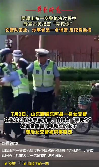 网曝山东聊城一交警执法过程中辱骂市民扬言“弄死你”,交警队回应:涉事者是一名辅警后续将通报。
