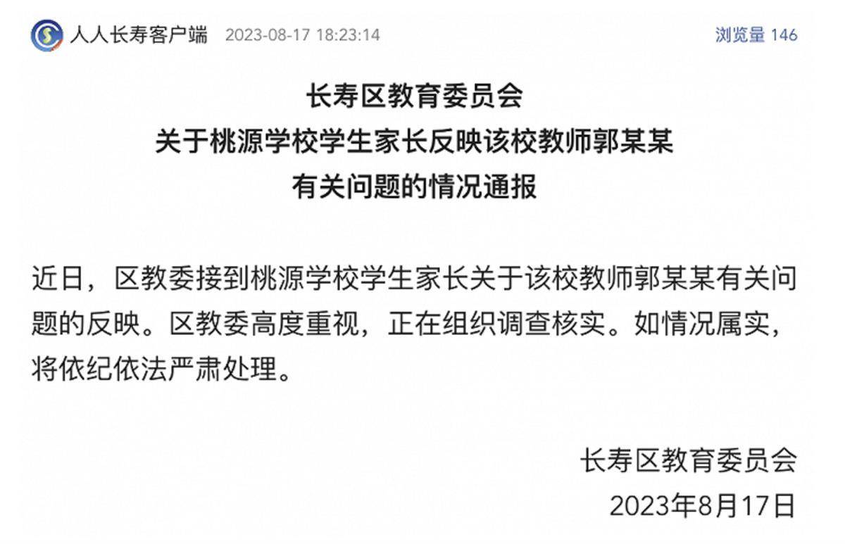 原标题:重庆男老师被指出轨小20岁的学生妈妈,长寿区教委回应:正调查核实 一段网络流传的视频显示,一名男子与年轻女子在电梯里搂抱。网友投诉称,男老师出轨学生妈妈,两人相差20岁。 据人人长寿客户端8月17日消息,重庆市长寿区教育委员会发布关于桃源学校学生家长反映该校教师郭某某有关问题的情况通报。 通报(图源:人人长寿客户端) 近日,长寿区教委接到桃源学校学生家长关于该校教师郭某某有关问题的反映。区教委高度重视,正在组织调查核实。如情况属实,将依纪依法严肃处理。 据百姓关注此前报道,近日,重庆有家长举报称其孙子的48岁小学班主任出轨28岁儿媳。视频显示,一男一女同时进入电梯内,之后女子贴近男子,男子顺势搂住了她。 男女搂抱(图源:视频截图) 8月16日,女子婆婆称,儿媳在5月份离家出走了联系不上,孙子就要自己去男老师所住地找儿媳,然后发现二人从一个小区走出来,监控视频里举止亲密,并于5月举报到教育部门,现在儿子因为这件事都睡不着觉。 婆婆称,儿媳出轨的男老师是孙子的班主任,对方态度嚣张,也并未道歉。“我们已经将他举报了。” (极目新闻综合澎湃新闻、百姓关注报道) |