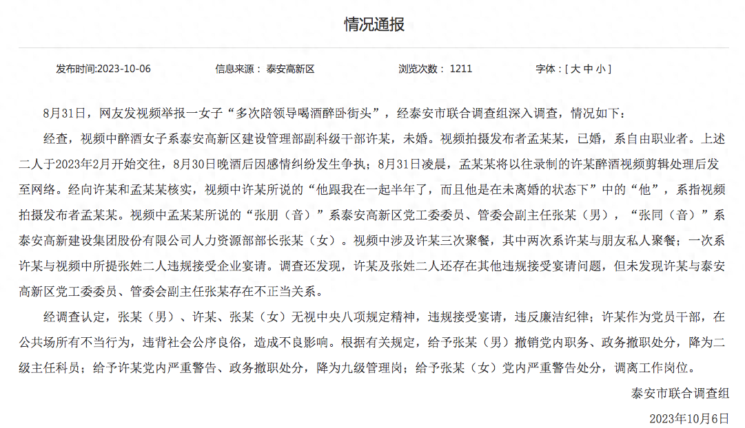 原标题:女子陪领导喝酒醉卧街头?山东泰安通报:3人受处分 8月31日,网友发视频举报一女子“多次陪领导喝酒醉卧街头”,经泰安市联合调查组深入调查,情况如下: 经查,视频中醉酒女子系泰安高新区建设管理部副科级干部许某,未婚。视频拍摄发布者孟某某,已婚,系自由职业者。上述二人于2023年2月开始交往,8月30日晚酒后因感情纠纷发生争执;8月31日凌晨,孟某某将以往录制的许某醉酒视频剪辑处理后发至网络。经向许某和孟某某核实,视频中许某所说的“他跟我在一起半年了,而且他是在未离婚的状态下”中的“他”,系指视频拍摄发布者孟某某。视频中孟某某所说的“张朋(音)”系泰安高新区党工委委员、管委会副主任张某(男),“张同(音)”系泰安高新建设集团股份有限公司人力资源部部长张某(女)。视频中涉及许某三次聚餐,其中两次系许某与朋友私人聚餐;一次系许某与视频中所提张姓二人违规接受企业宴请。调查还发现,许某及张姓二人还存在其他违规接受宴请问题,但未发现许某与泰安高新区党工委委员、管委会副主任张某存在不正当关系。 经调查认定,张某(男)、许某、张某(女)无视中央八项规定精神,违规接受宴请,违反廉洁纪律;许某作为党员干部,在公共场所有不当行为,违背社会公序良俗,造成不良影响。根据有关规定,给予张某(男)撤销党内职务、政务撤职处分,降为二级主任科员;给予许某党内严重警告、政务撤职处分,降为九级管理岗;给予张某(女)党内严重警告处分,调离工作岗位。 泰安市联合调查组 2023年10月6日 来源 泰安高新区 |