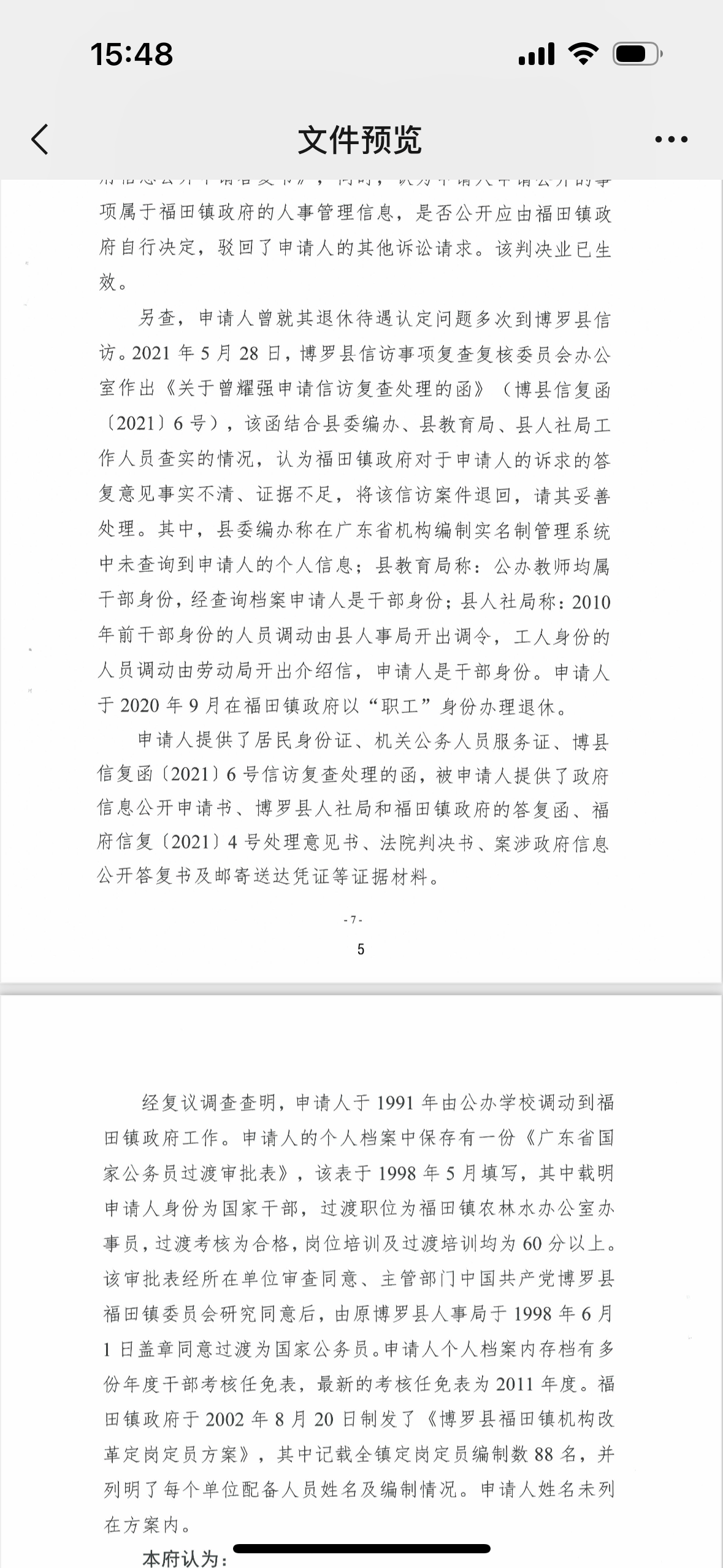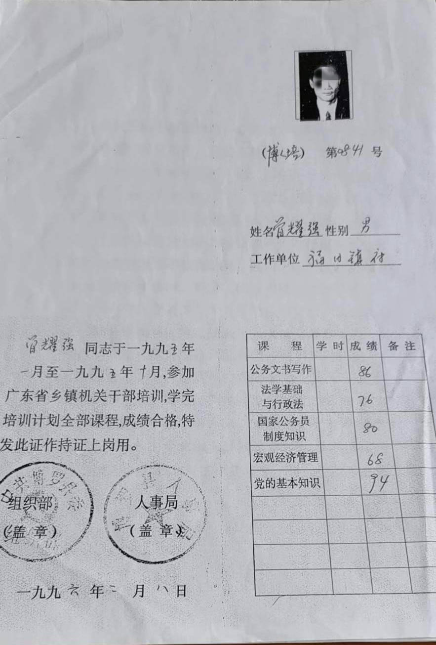 曾耀强的工作证件 本文图均为 受访者 供图 本是公办教师,后以“干部身份”调到镇政府工作近30年,办理退休手续时却被告知没有编制,属于“职工身份”……近三年,63岁的曾耀强都在为此事奔走。他称,在退休前,他一直以为自己是公务员。 曾耀强居住在广东惠州市博罗县,退休前在博罗县福田镇政府工作。惠州市人民政府作出的一份《行政复议决定书》显示,1991年,曾耀强从公办学校调动到福田镇政府工作,其个人档案有一份《广东省国家公务员过渡审批表》,填写时间为1998年5月,其中载明曾耀强身份为国家干部,过渡职位为福田镇农林水办公室办事员。该审批表经所在单位审查同意、主管部门研究同意后,由原博罗县人事局于1998年6月盖章同意过渡为国家公务员。此外,曾耀强的档案内有多份年度干部考核任免表,最新的考核任免表为2011年度。 针对曾耀强的疑问,福田镇政府曾多次答复,其给出的重要依据是,福田镇政府于2002年8月20日制发的《博罗县福田镇机构改革定岗定员方案》,其中记载全镇定岗定员编制数88名,并列明每个单位配备人员姓名及编制情况,里面没有曾耀强的名字。 2023年10月9日,博罗县福田镇工作人员回应澎湃新闻(www.thepaper.cn)称,“干部身份”不等于有编制,签署了《广东省国家公务员过渡审批表》并经过相关培训,也并不意味着有行政编制。而且曾耀强的名字不在上述方案中,属于非编制人员。 曾耀强的儿子曾先生向澎湃新闻表示,曾耀强曾是公办教师,是有事业编制的,调到镇政府工作近30年,原以为已经转为行政编制,但退休时却发现什么编制都没有了。假设曾耀强属于普通职工,这是要签订劳动合同的,但曾耀强从来没有签过劳动合同。 曾耀强曾参加广东省乡镇机关干部培训,且成绩合格。 由公办教师调动到镇政府工作近30年 1960年出生的曾耀强,于1976年参加工作。据曾耀强介绍,1978年以后,他在当地中小学任教,是民办教师,1985年7月由民办教师转为公办教师。1991年,他调动到福田镇政府工作。 曾耀强的儿子曾先生介绍说,进入福田镇政府工作后,曾耀强在福田镇政府担任过企业办公室副主任、经管站副站长等职务,退休前为福田镇政府人大办公室的一名办事员。2020年9月,曾耀强办理退休时被告知,因查询不到可证明其公务员的材料,不能认定其作为公务员退休,只可按普通企业职工办理退休。 在镇政府工作了近30年,曾耀强一直以为自己是公务员。而且,作为公务员退休,还是按企业职工退休,二者的退休待遇相差较大。曾耀强无法接受按企业职工退休的决定,曾多次跟福田镇政府沟通,并进行信访,要求恢复其公务员身份,以公务员身份退休。 “调动时县委组织部及县人事局均明确本人为编制内干部,我亦未签署过任何关于身份变更的文书。我要求福田镇政府正视我的合理诉求,切实保障我的合法权益。”曾耀强说。 澎湃新闻注意到,博罗县信访事项复查复核委员会办公室于2021年5月作出的《关于曾耀强申请信访复查处理的函》显示,针对曾耀强反映的问题,博罗县教育局工作人员称,办公教师均属于干部身份,经查询档案曾耀强是干部身份;博罗县人社局工作人员称,“2010年前干部身份的人员调动是由县人事局开出调令,工人身份的人员调动是由劳动局开出介绍信,申请人(指曾耀强)是干部身份”。 2023年2月,惠州市人民政府作出的一份《行政复议决定书》显示,1991年,曾耀强从公办学校调动到福田镇政府工作,其个人档案有一份《广东省国家公务员过渡审批表》,填写时间为1998年5月,其中载明曾耀强身份为国家干部,过渡职位为福田镇农林水办公室办事员,过渡考核为合格,岗位培训及过渡培训均为60分以上。该审批表经所在单位审查同意、主管部门研究同意后,由原博罗县人事局于1998年6月盖章同意过渡为国家公务员。此外,曾耀强的档案内有多份年度干部考核任免表,最新的考核任免表为2011年度。 福田镇政府曾答复称,曾耀强虽是干部身份,但不等同有编制。 镇政府:干部身份不等同有编制 2002年8月,福田镇政府制发的《博罗县福田镇机构改革定岗定员方案》,其中记载全镇定岗定员编制数88名,并列明每个单位配备人员姓名及编制情况,曾耀强的名字没有列在方案内。据上述《关于曾耀强申请信访复查处理的函》,博罗县委编办工作人员称,广东省机构编制实名制管理系统未查询到曾耀强的个人信息。 在一份信访答复中,福田镇政府回复称,经查询,曾耀强并未纳入《博罗县福田镇机构改革定岗定员方案》内,属于编制外人员。曾耀强“虽是干部身份,但不等同有编制”。在另一份信访答复中,福田镇政府称,根据《博罗县福田镇机构改革定岗定员方案》,曾耀强没有纳入定岗定员方案内,属于非编制人员,曾耀强本人也知道此事。后来,曾耀强也没有通过其他招录方式考录进体制内,因此在办理退休时仍属非编制人员,按政府规定享受非编制人员退休待遇。 针对此事,2023年10月9日,福田镇工作人员回应澎湃新闻称,“干部身份”不等同于有编制,签署了《广东省国家公务员过渡审批表》并经过相关培训,也并不意味着有行政编制。 曾耀强向澎湃新闻表示,在退休前,他并没有见过《博罗县福田镇机构改革定岗定员方案》,只是退休后才被告知有该方案。据其透露,2002年,福田镇相关负责人曾表示,在关于镇政府全体工作人员的测评会中,曾耀