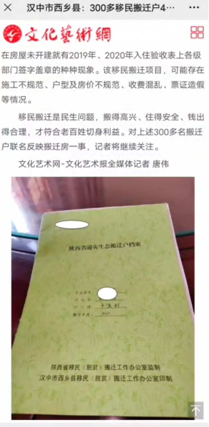 惠民工程成了商品房?陕西西乡县中渡移民搬迁四期安置点356户业主有话说 独立撰稿人 李海波 陕西省南部的汉中、安康、商洛三市,地处秦岭巴山腹地,属于全国11个集中连片特困地区之一。据报道按照“政府主导,群众自愿,统一规划,分步实施”的原则,陕西省采取整村组搬迁和相对集中安置的方法,实施避灾扶贫生态移民搬迁工作,走出了一条城乡一体化抓扶贫、不再简单复制农村、从根本上挖掉穷根的扶贫开发新路子。 然而,汉中市西乡县中渡移民搬迁四期安置点业主代表向撰稿人投诉,说好的自筹交费后不再收费,收房时却还要交5-10万元!经他们调查发现该安置点存在的问题高达17个,媒体曾经报道过,但至今没有解决…… 向省信访局提交上访材料 反映项目存在多问题 据了解,8月29日,中渡移民安置四期全体业主向省信访局递交了上访材料,提出来七个方面的诉求。 一是该惠民工程房是2019年4月左右购买,每户自筹交费10-15万元。中渡村委当时告知住户第二年即可收房,最多再给手续费就不会再有任何费用。但实际上过了四年住户都没有收房,到今年6月下旬才接到村委会电话领取钥匙,而到场后被告知还要再交5-10万元才能领房。应该房为惠民工程,买房者多为经济困难户,原自筹资金都是贷款,现房价严重超过业主的经济承受能力,导致大家居无所有,因建造进度滞后造成的成本上升由被上访单位承担。 原规划图,上面橙色的是规划中渡村自建房,没有别墅。 二是通过原图纸与现状做对比,原规划与现设计存在严重不符,且未通知任何业主知悉;环山公路与绿化面积全无,现已被占用修建别墅(原设计五号楼后为生活广场,实际无;当时自筹资金承诺从从国道进小区是8米的水泥硬化路面,并配套照明设施,实际杂乱不堪、道路偏窄);经与西乡县城南工作人员提供的资料、建造的车库、物业办楼所用资金均属于业主自筹,导致整体房价升高由业主分摊,私自变更未征得全体多数一半以上的业主同意,高出的费用理应由变更人或单位承担。 三是通过5次与负责移民搬迁工作人员进行对话,该项目工作人员给出再次缴纳的金额不一,多次强调比商品房便宜,把民生工程变成了商品房工程来讨价还价;工作人员每次出具的费用只有一个总账,无具体明细、清单;部分施工项目实际无,但核算较高的费用(比如人防)。对此,各业主对该项目的费用极度不认可,请移民办及相关工作人员出具所有房屋建造具体费用清单、招标书,并请第三方(有资质且广大业主认可的)审计审核公示给广大业主,提升信任度。 四是购房前期,业主去买房工作人员反馈说没有房,实际房都在相关工作人员手里,需要通过第三方额外收费才能获得购买的权利,部分业主缴费从几千到几万的不等,涉及金额高达几十万以上,这属于严重的贪污受贿行为,请上级单位严查。 五是该工程房屋从现场实际情况来看,多处房屋地基下沉,出现裂缝,入户门非防火门,不符合消防法规定。请上级政府协查房屋安全问题,整改不良,符合法律法规。 六是以上诉求都是由被上访单位的欺诈、拖延、不作为和过错等行为,上访人与被上访单位多次协调未果。上访人作为合法的所有权人,有权要求被上访单位及个人依法履行其应承担的责任,还广大业主的一个家。 七是356户业主在地方官员不足纪委及上下级官员的袒护下,老百姓上诉无门上诉无果的困境下,只能请求陕西省信访局组织专项组对西乡县相关人员进行突击检查,还老百姓一个真实可信的真相。 有59人签字付了额外费用 同日,全体业主于8月20日向汉中市纪委举报中渡村支书李长安、时任主任史业生存在严重贪污受贿行为。购房前期符合移民搬迁条件的业主去登记买房,村委会相关人员说没有房源了,实际上房源都在李长安、史业生和在西安承揽工程的秦学军手里。村民需要额外交费才能获得购买资格。据收集的证据他们利用第三方收取了57户符合购买条件的业主,每户几万元不等,共收取了731300元! 据业主代表介绍:秦学军不是本一期搬迁建筑人员,他是外包工人员,也是中渡村干部安插的收钱人员。 城南街道办回复多达17个问题 但不尽人意 对于移民搬迁业主的诉求,西乡县城南街道办进行了以下回复。 一.规划设计与现实建筑不符。 五号楼南侧规划是生活休闲广场,实际没有。而自筹承诺的从国道进小区是8米的水泥硬化路面并安装路灯、绿化,实际为乡村公路,杂草丛生。 实施前,城南街道委托设计单位编制了《修建性详细规划》,实施中安置房楼栋按照总体规划(鸟瞰图)布置,配套设施按照规划实施。生活广场是因为县政府决定从四中经安置点向东修一条快速干道而被占用;水泥路问题需争取其他部门项目资金解决。加之建设施工期间无法实施,下一步城南办将积极争取发改、交通等部门项目资金,力争早日硬化该段道路并完善路灯及绿化配套设施。 二.工程的总造价未公开、不透明。(必须公开原设计图造价) 1.工程最高限价合计7773万元;2.工程中标价合计是7474.66万元,低于最高限价;3.工程审计定案价为7534.49万元。 三.交自筹款项时的承诺与现实报价不符。(有复印件为证,原承诺的是12万元、15万元可以入住足够了) 2019年4月,搬迁户到中渡村委会缴纳定金,当时并未承诺12-15万元“入住足够了”。该安置点房屋造价经核算总造价2081元/平米,电梯房增加电梯安装费103元/